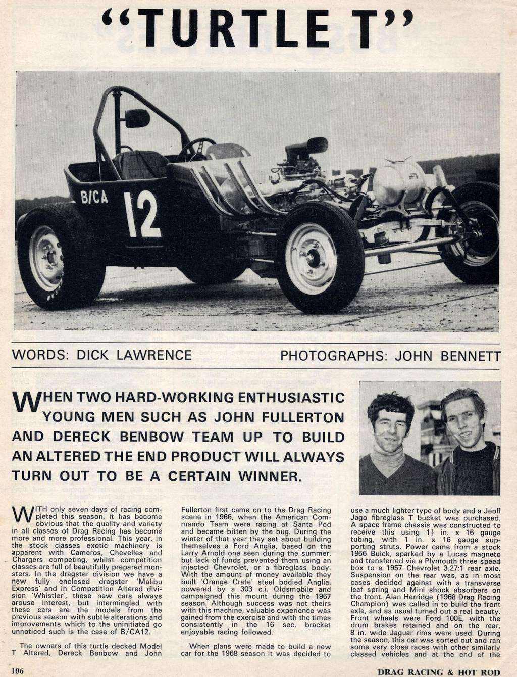 As told exclusively to Preface: John Fullerton attended the 1964 Drag Festival and using skills acquired from his day job, built with partner Derek Benbow a Ford Pop called Orange Crate which came out in 1967. They then bought a turtle T body from Geoff Jago and built Turtle T, running it from 1968 through 1969, then rebuilding it for 1970. After selling the rolling chassis to the Stones family who renamed it Tee Rat, John and Derek then built an injected nitro slingshot dragster, running it until 1973 following which it was sold to Tony Froome who ran it as Nitromania. Eurodragster.com thanks John for providing his story and John Hunt and Nick Pettitt for help with editing and proof reading the feature and making archive images available.