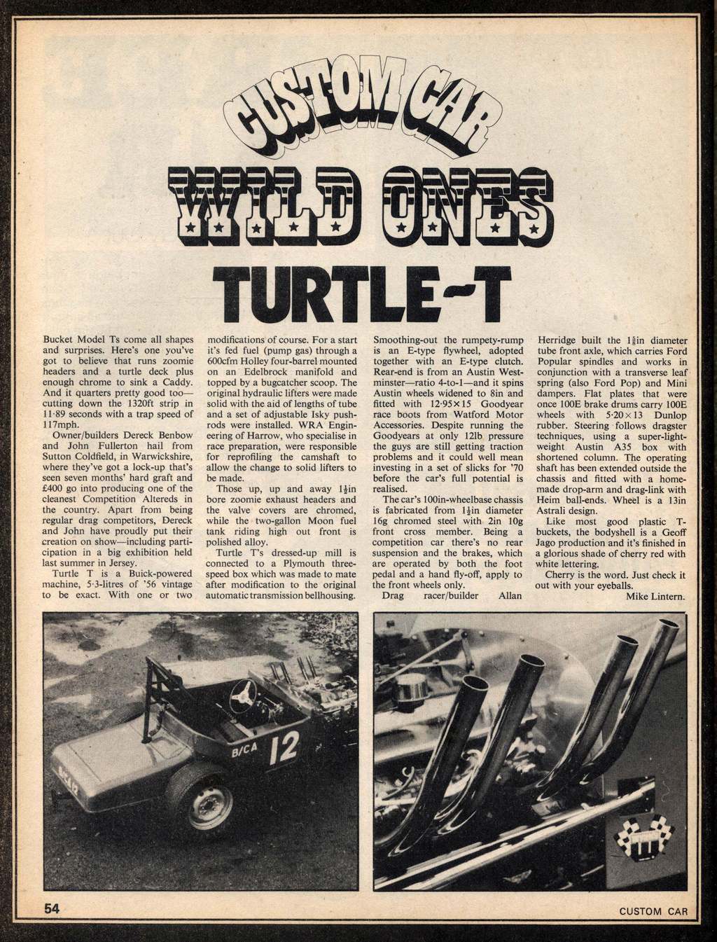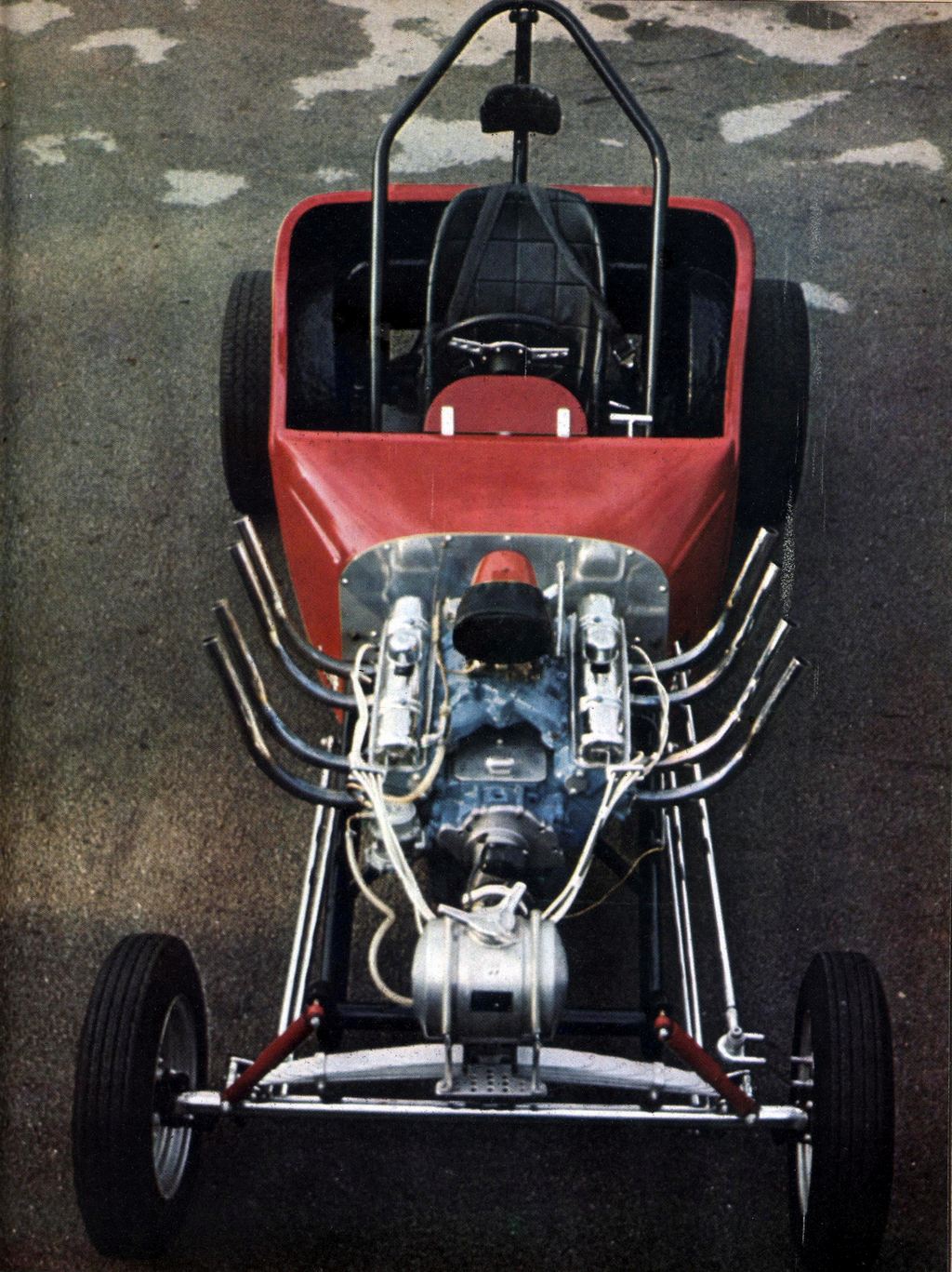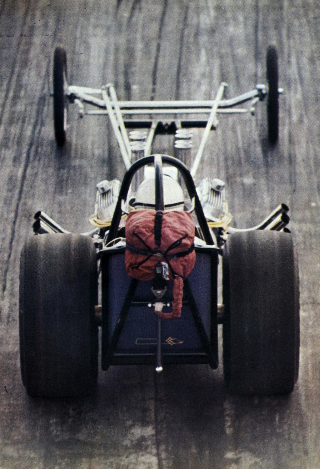 We called it Turtle T and had it ready for the October 6th 1968 meeting at Santa Pod, running it till the end of the year. We then decided to develop Turtle T further and built version two with a new stronger chassis and made cut outs in the body to clear the 12.95 x 15 Goodyear racing tyres supplied by Pete Atkins. Pete also ran a T Altered but didn’t use a turtle deck, he just had a box on the back.
