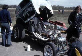 Then we decided to update it again building version three for 1970. The body was narrowed by taking out about 12 inches through the centre then re-joined and we built a stronger roll cage. The Buick came out and we fitted a Pontiac motor. I spent a lot of money on the Pontiac. Over bored 3/16th, new camshaft and fuel injection. It now looked the part like a proper Altered and we renamed it Tee Total.