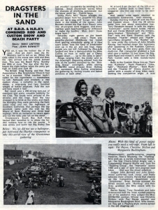 During 1968 Bill decided to start building a new car for 1969 and ordered a new chassis from Harold Bull who had also built the chassis for Derek Metcalf's car 'Strip Star' which came out in 1968. I helped Bill throughout the 1968 season and also with the new 1969 car named 'Quarter Horse' During 1967 and 1968 seasons of going to Santa Pod as I also had an interest in bike racing I became vaguely acquainted with Alf Hagon and found out that he had a shop in Leytonstone in east London, where he also repaired and sold bikes. When Bill wanted some Duraluminium to make the clutch shield and firewall for Quarter Horse, I phoned Hagon's shop and they said that they were happy to sell us some so, as I worked in the City, I got a Tube to Leytonstone and collected it. I looked a bit out of place there, in my work suit and tie. Having passed my driving test and acquiring my first car, a 1957 Hillman Minx, I had a tow bar fitted and Bill and I took the front bumper off and replaced it with a lump of wood with a thin piece of steel plate as a 'face' so that I could use the car as the push car for the 1969 season. Bill managed to borrow a motorcycle trailer from his boss and we used to lash planks of wood to it so that we could load Quarter Horse onto it. Quarter Horse had the same engine that had been in Konkerer with a few modifications such as fuel injection, which I believe was also made for Bill by Harold Bull, and magneto ignition. I think that also the original shortened Jaguar rear axle that was in Konkerer was replaced with a much lighter one. I think it was towards the end of the 1968 season but also during the 1969 season that we got to know Barry Green, he had some connection with Bardahl oil and used to get it for us as 'sponsorship'. As well as attending meetings at Santa Pod and other venues we all went to Greatstone again in 1969 it was a bigger event this time. Also in 1969 Richard had finished the Healey and in August of that year we went on holiday to a caravan park in Clacton that I arranged for us. We had enough of Clacton after a week and drove home.
