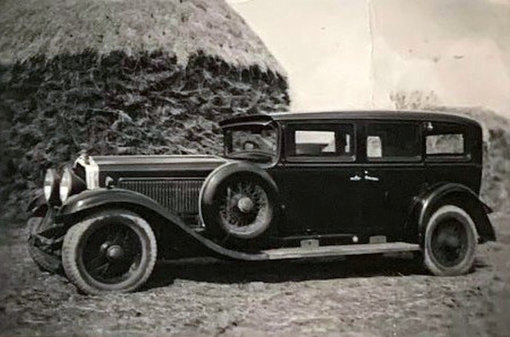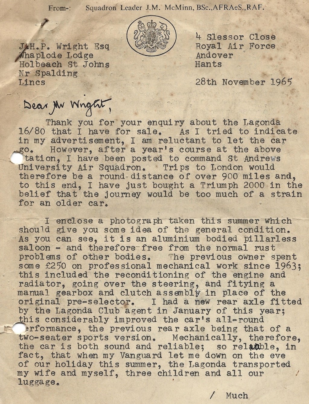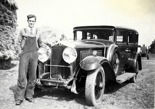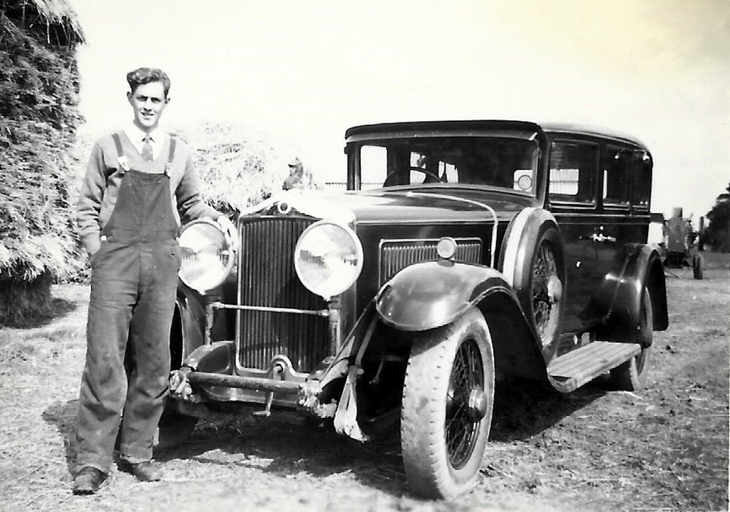 All these cars my father owned; one was a 1950 Healey Sportsmobile (14) only 70 were made. The Lagonda Rapide (15) was one of only 20 made. Bought unseen in 1945 for £300, it was sent from the Lake District to Spalding by train. Dad had to run it on bald tyres as new ones were not available. It was sold for £1000. Look at that, it's a 1927 Belgian Minerver (16-17), one of the biggest cars ever made, that's in our farm yard, a straight 8 sleeve valve engine, it was for sale for £40. I wanted it but only had £20 and Dad wouldn't loan the other £20, it got broken up.