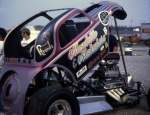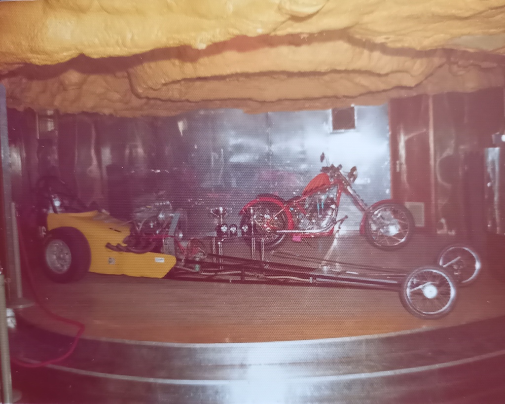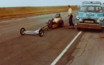 Back in England, we were still going to Santa Pod to watch the sport evolve in the UK with visiting drivers from America and also Sweden bringing their cars over to compete. Bill was running his car and Richard Jarman had bought Derek Metcalf's V4 rail Stripstar. I used to go with Richard to meetings at Pod and the NDRC meets at Blackbushe, Hullavington and others. As I am not mechanically minded I drove the pushcar and cooked the meals, breakfasts and bbqs. Like a lot of people we always thought the Barn, looking down the track, was the best place to watch the racing as the burnouts took place right in front of you. I think I inhaled more tyre smoke than I did from cigarettes, not to mention bleach on my clothes. On one occasion we were chatting to a chap named Gary Whitehead whom we had met on several occasions and unbeknown to us had recently bought Tony Anderson's V6 powered rail called Trouble. His partner, however, did not want him to drive it for fear of having an accident. Gary asked us if anybody wanted to drive for him and without thinking I said yes! Next thing I knew I was buying a crash helmet and firesuit and applying for a competition licence. Gary had renamed the car Frustration and I am not sure whether this came about because he could not drive it or because he could not get it to run very well! When I first drove the car I thought this is a lot quicker than my old Morris and kept backing off the throttle. I had a chat with Alan Herridge afterwards and he said just look straight ahead and keep my foot on the pedal- next run nearly four seconds quicker! It is definitely the quickest and fastest vehicle that I had driven but after those first two runs I really started to enjoy myself. Gary soon lost all interest and sold the car to me which I then renamed it Whiskey Peddler. Having bought the car I suddenly had a racecar and trailer but had not thought about where I was going to keep it or how I was going to tow it, I did not even have a tow car! My friend John Smith managed to find a garage in a block of four or five at Maybury Rough, just outside of Woking. That took care of the dragster, but I still did not have anywhere for the trailer. In the end the car stayed on the trailer and the whole lot was pushed into the garage, but the trailer's A frame would not fit in. Luckily the garage had a rear door so the main doors were tied as securely as possible to the trailer from the inside and we would use the rear door for entering and exiting. Not ideal, but it solved the problem,luckily it was a quiet neighbourhood and there was no theft or vandalism.