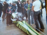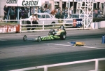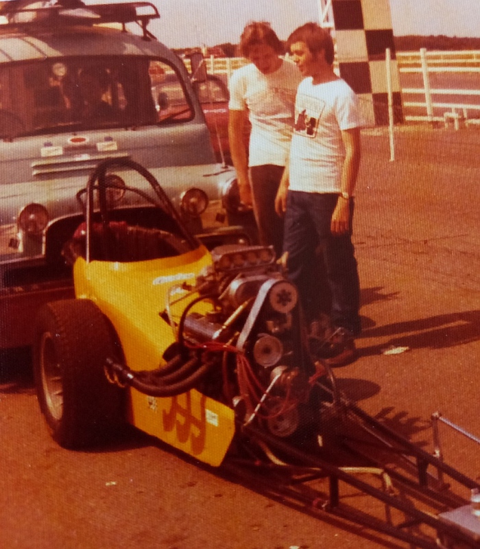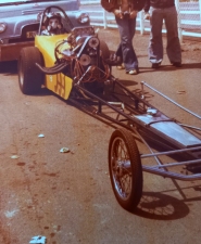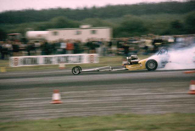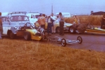 Our first meeting under the name Whiskey Peddler was April 14th 1974 at Blackbushe. John Smith helped me out as much as he could, but being a married man, also had a family to concentrate on. The car started up and sounded ok, but would not pull off the startline like it should. Back in the pits, we pulled the heads off and the six pistons had been ruined by the fuel mixture being too lean. This was my first major expense with it. One weekend I was invited, along with Tony Anderson and Russ Carpenter, to have the cars on display at The Pirbright Institute for their fete. Although it was a static display we decided to start the cars up as there was room to push start them and then return to the display area. Tony suddenly shouted at me to shut off. The outer casing of the Wade supercharger had split in half. Had this happened during a race I might have had my face rearranged by bits of supercharger! Tony said it was probably due to the aluminium rotor shafts flexing due to the load that they were under. Tony had another casing that I could use, so I contacted Wades Factory in Brighton and they made up some special steel shafts and the problem was solved. I also contacted David Newman Camshafts at Farnborough in Kent and had the camshaft upgraded to give the engine more power. I had loads of help from Tony Anderson and spent many hours in his workshop learning about the car. Then going up to his lounge above the garage listening to music along with the odd glass of cider. I knew Tony ran the car with a drop of nitro in the tank but I decided to just use methanol partly due to costs and also to stay in a class where I could be competitive. With a change of camshaft and help from Tony the car started to run really well. We attended events in 1974, 14th-15th April, 5th May at Santa Pod, 11th-12th May at Blackbushe, 15th-16th June at Silverstone, 6th-7th July 21st July at Santa Pod, 18th August at Blackbushe, 14th-15th September at Silverstone, lastly 29th September Snetterton. In 1975 we attended 13th April at Blackbushe, 3rd-4th May at Snetterton, 24th-26th May at Santa Pod, 14th-15th June at Wroughton, 5th-6th July at Santa Pod, 20th July at Snetterton, 17th August at Blackbushe, 6th-7th September at Snetterton, 20th-21st September at Santa Pod, lastly 5th October at Blackbushe. My last race meeting was 16th-19th April 1976 Santa Pod. A few snippets from these meetings, including races with my friends Russ Carpenter and Bill Haynes: at Wroughton on June 14th-15th 1975, the blower drive sheared and I was beaten by Alan Sharpe driving Methdrinker. At Snetterton on 20th July 1975, Russ Carpenter beat me and I recorded a 10.18 139mph. At Blackbushe 5th October 1975, I broke on the line in the final with Russ who had beaten Bill in the semi final.