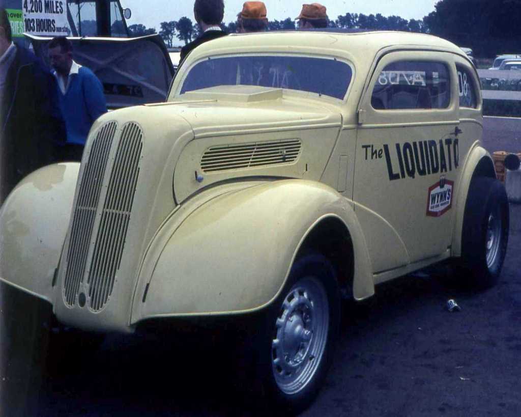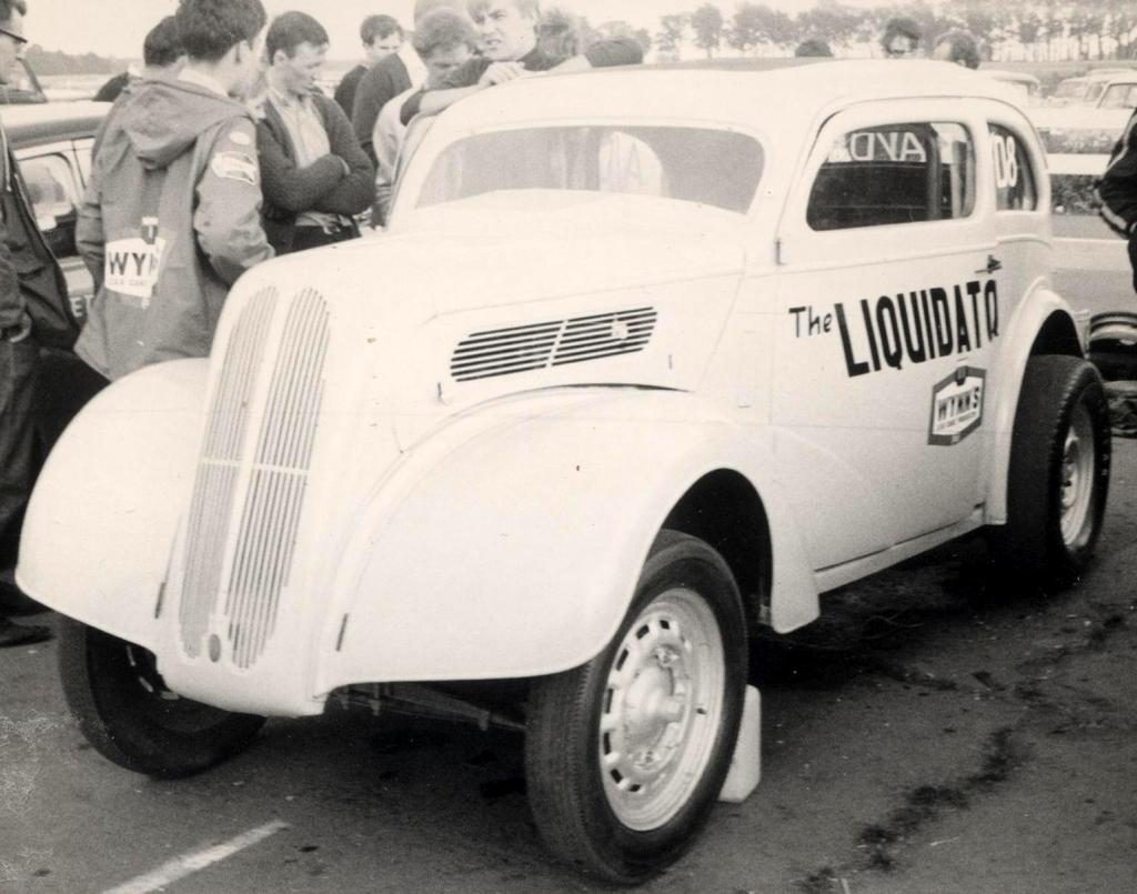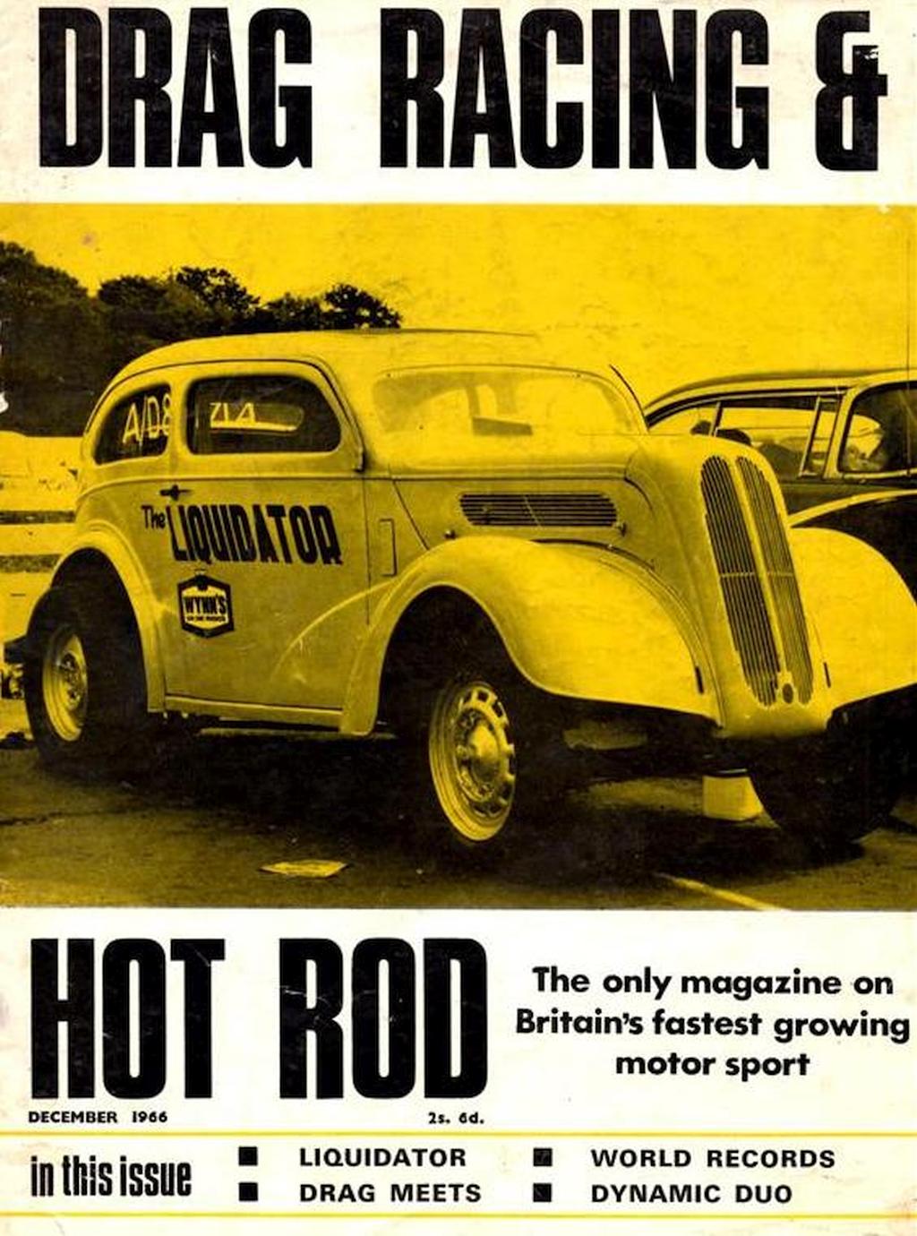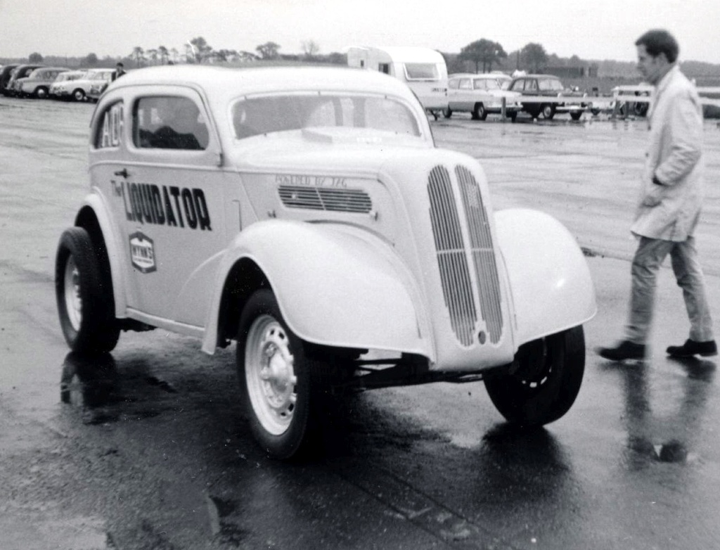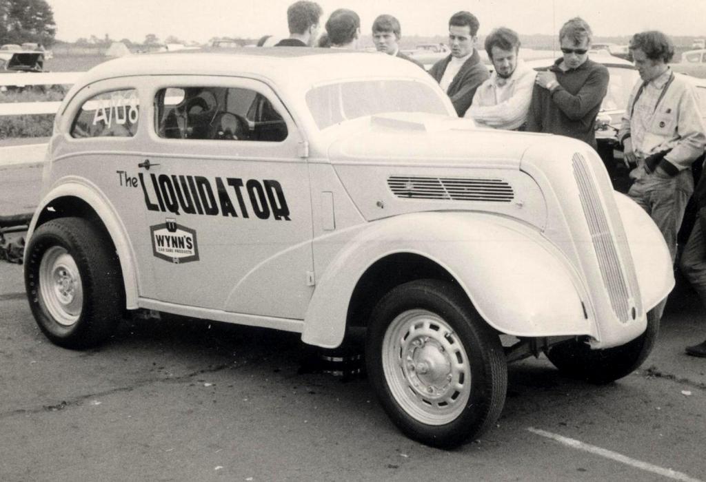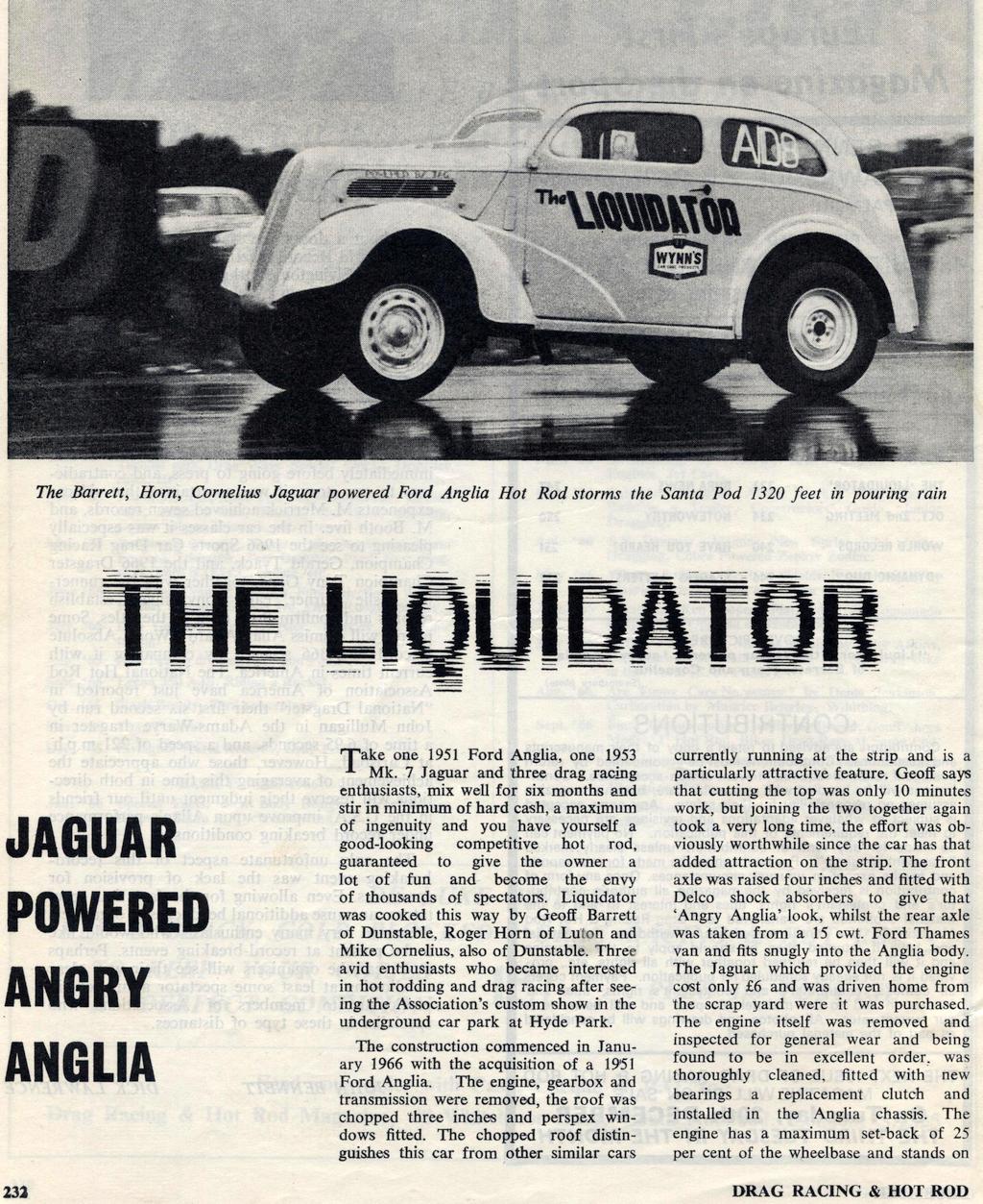 The Liquidator is one of those memorable cars from the early days of UK drag racing that people still talk about. It had a great name and the roof chop gave it a very striking appearance. Built by Geoff and Norman Barrett, Roger Horn and Mick Cornelius, who all came from the Luton and Dunstable area. Geoff Barrett... I was born in Dunstable and moved to the village of Ivinghoe, and then back to Dunstable at seventeen years of age due to dad's health. I started as an apprentice at AC Delco finishing up as a maintenance fitter. Late 1965 after watching the American drag teams at the 1964 – 65 Dragfests, Mick Cornelius, Roger Horn and myself decided to get involved in drag racing and the decision was made to build a Jag engined Anglia. Based in Dunstable we bought the Anglia locally from a friend of a friend for I believe £1. We towed it to our rented garage to remove the running gear and clean up the chassis (wire brush, no pressure washer or power tools here!) Next, we bought a complete 1953 Jaguar Mark 7 through Exchange and Mart, in London for £3, and towed to Dunstable to remove the engine, trans. and instruments. We didn’t strip the engine down and ran it pretty much as it came out of the scrap yard. I do not know how we did all this with no lifting gear! We then decided to use a Ford Thames van rear axle because it had a better ratio for drag racing and we kept the Mark 7 Jag gearbox. I did all the welding, oxy acetylene in those days, and we decided to chop the top. Time consuming with lots of cutting and welding, but I think it came out well. This was done with hacksaws, welding and filling. Painting, for a few beers, was done in a painting booth, by a friend of Roger Horn and Mick Cornelius did the sign writing. It took about 9- 12 months to build the car and the total build cost was £20. The name The Liquidator came about because of a spy spoof movie of that name which was out in 1966 and the lettering style on the car is very similar to the lettering on The Liquidator film posters. In fact, at the request of a cinema in Luton we put the car in their foyer for the week of the movie, after they had seen a picture of the car in a local Luton newspaper.