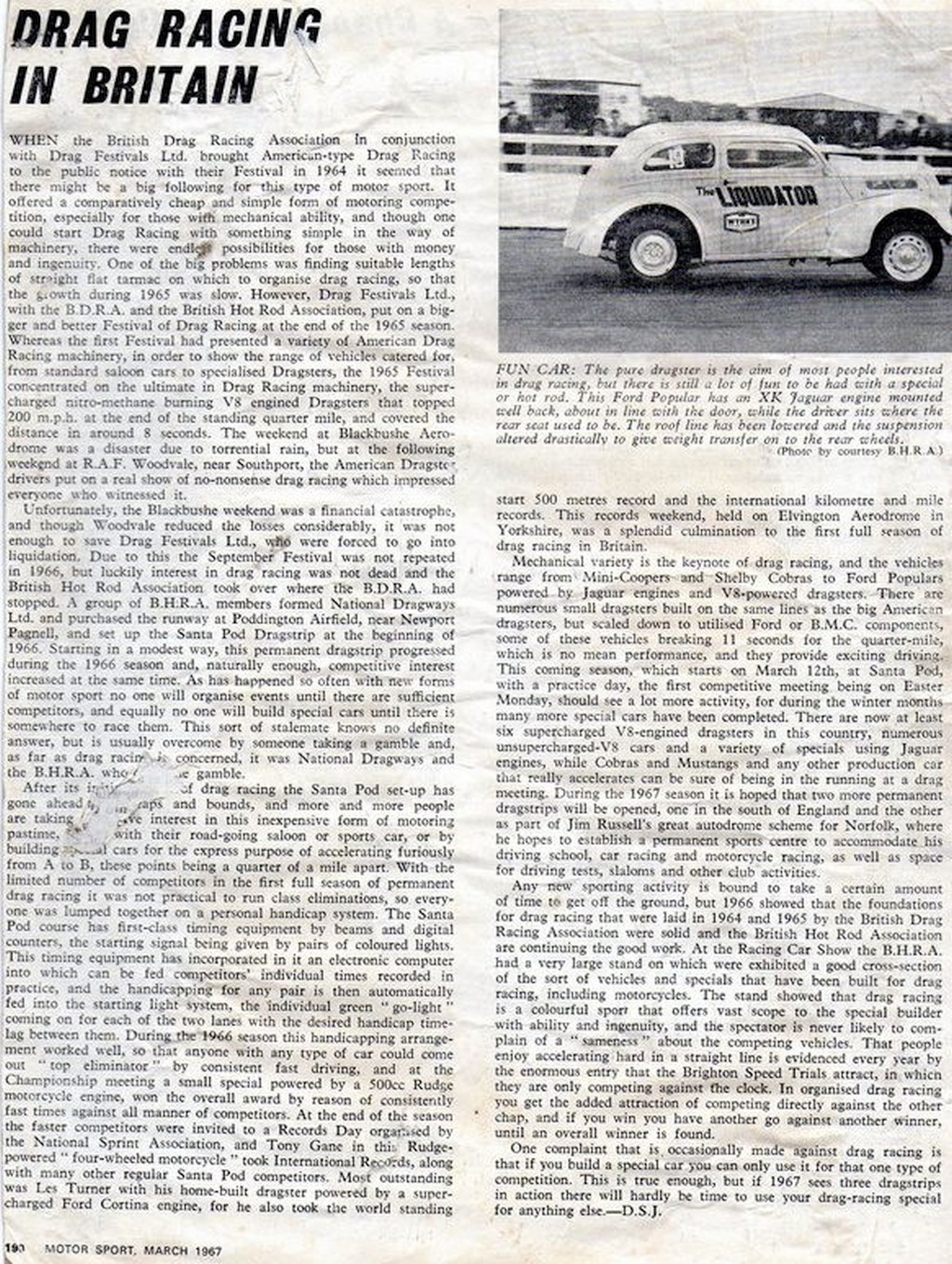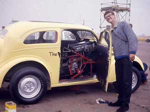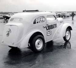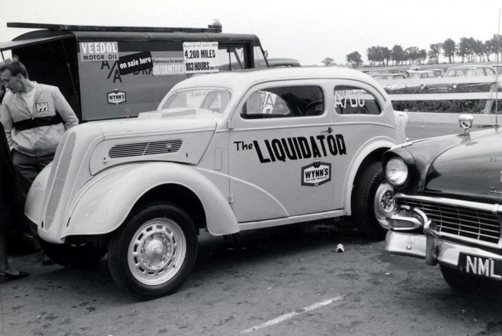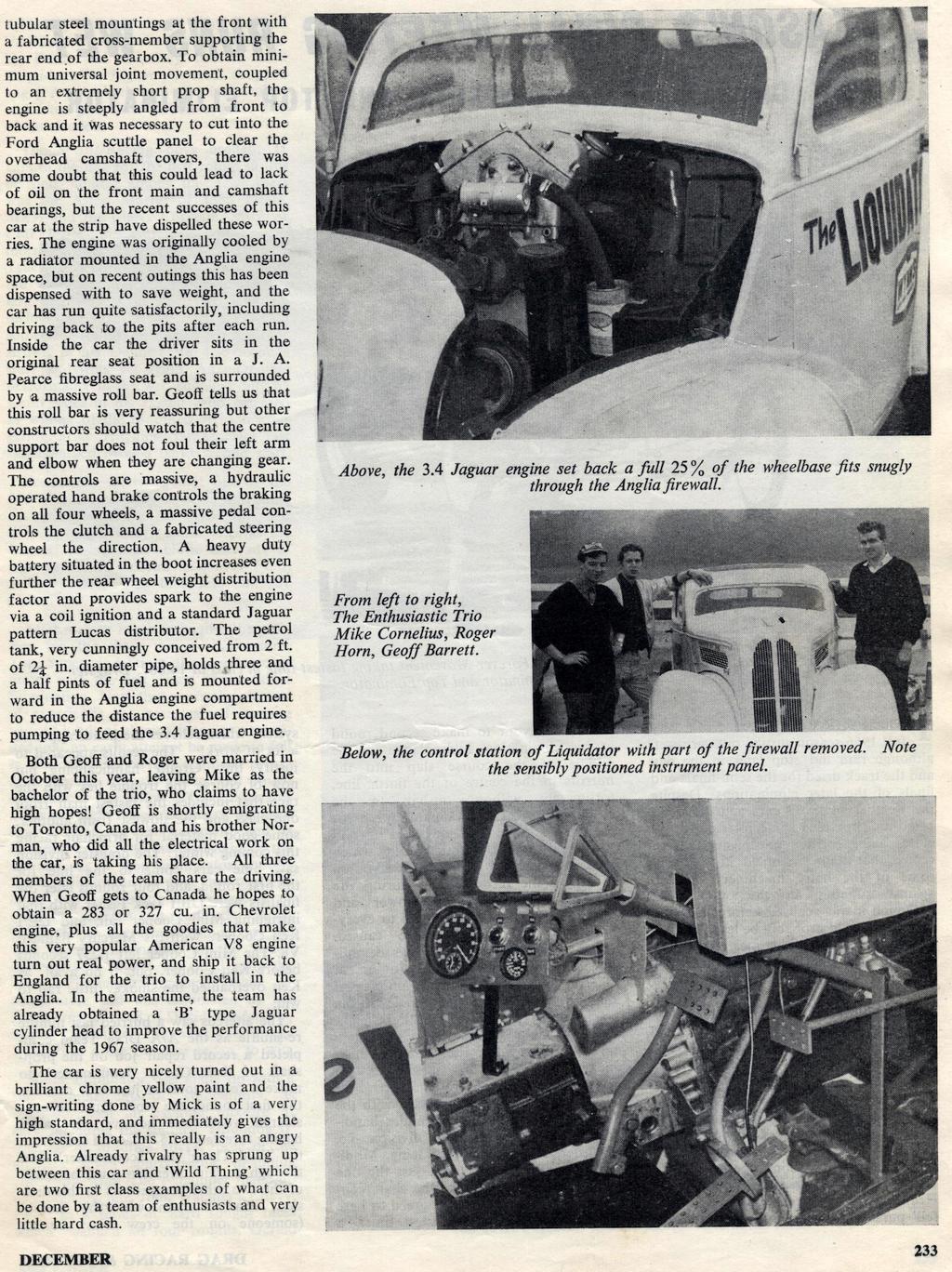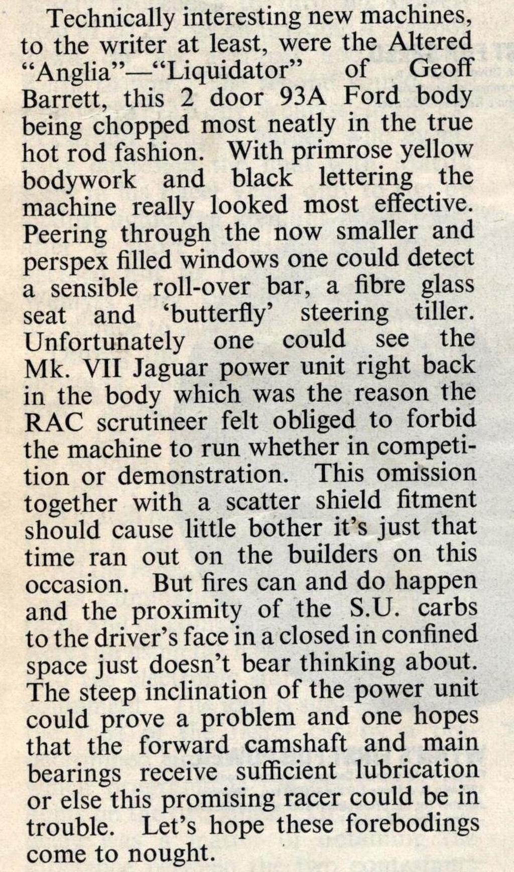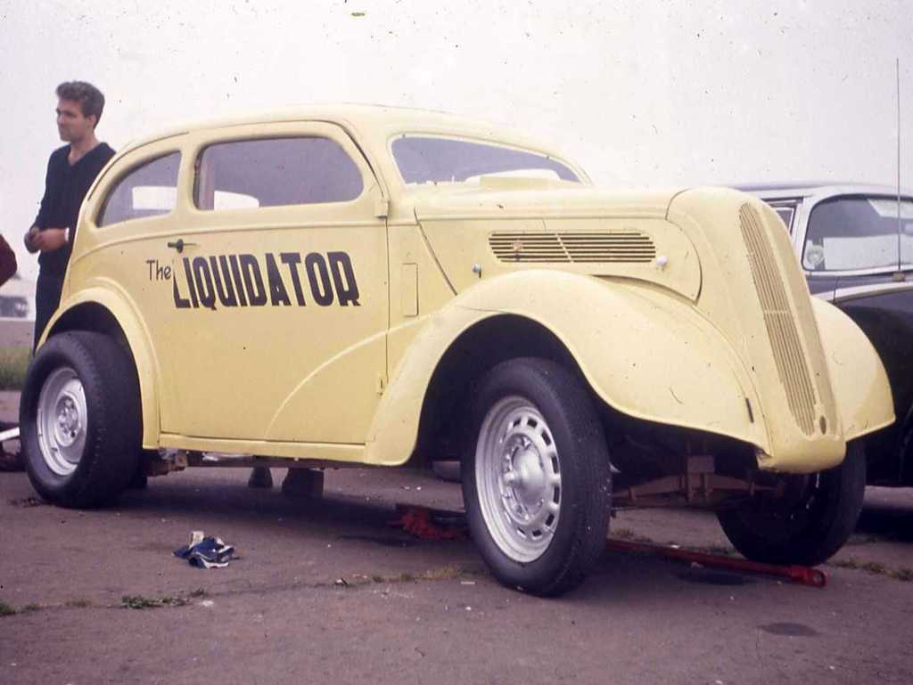 The Liquidator is one of those memorable cars from the early days of UK drag racing that people still talk about. It had a great name and the roof chop gave it a very striking appearance. Built by Geoff and Norman Barrett, Roger Horn and Mick Cornelius, who all came from the Luton and Dunstable area. Geoff Barrett... I was born in Dunstable and moved to the village of Ivinghoe, and then back to Dunstable at seventeen years of age due to dad's health. I started as an apprentice at AC Delco finishing up as a maintenance fitter. Late 1965 after watching the American drag teams at the 1964 – 65 Dragfests, Mick Cornelius, Roger Horn and myself decided to get involved in drag racing and the decision was made to build a Jag engined Anglia. Based in Dunstable we bought the Anglia locally from a friend of a friend for I believe £1. We towed it to our rented garage to remove the running gear and clean up the chassis (wire brush, no pressure washer or power tools here!) Next, we bought a complete 1953 Jaguar Mark 7 through Exchange and Mart, in London for £3, and towed to Dunstable to remove the engine, trans. and instruments. We didn’t strip the engine down and ran it pretty much as it came out of the scrap yard. I do not know how we did all this with no lifting gear! We then decided to use a Ford Thames van rear axle because it had a better ratio for drag racing and we kept the Mark 7 Jag gearbox. I did all the welding, oxy acetylene in those days, and we decided to chop the top. Time consuming with lots of cutting and welding, but I think it came out well. This was done with hacksaws, welding and filling. Painting, for a few beers, was done in a painting booth, by a friend of Roger Horn and Mick Cornelius did the sign writing. It took about 9- 12 months to build the car and the total build cost was £20. The name The Liquidator came about because of a spy spoof movie of that name which was out in 1966 and the lettering style on the car is very similar to the lettering on The Liquidator film posters. In fact, at the request of a cinema in Luton we put the car in their foyer for the week of the movie, after they had seen a picture of the car in a local Luton newspaper.