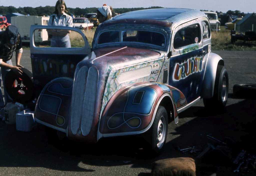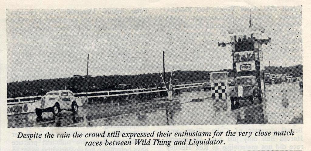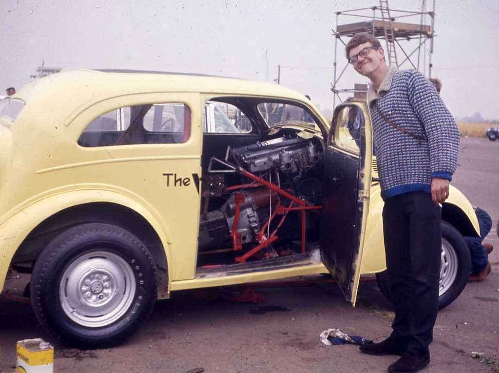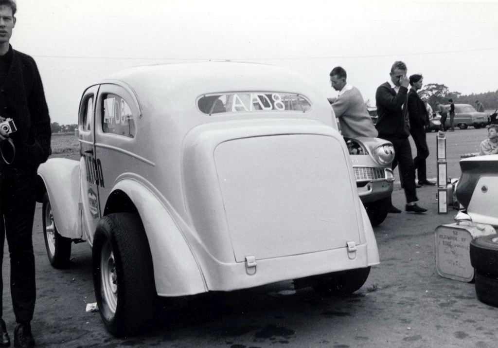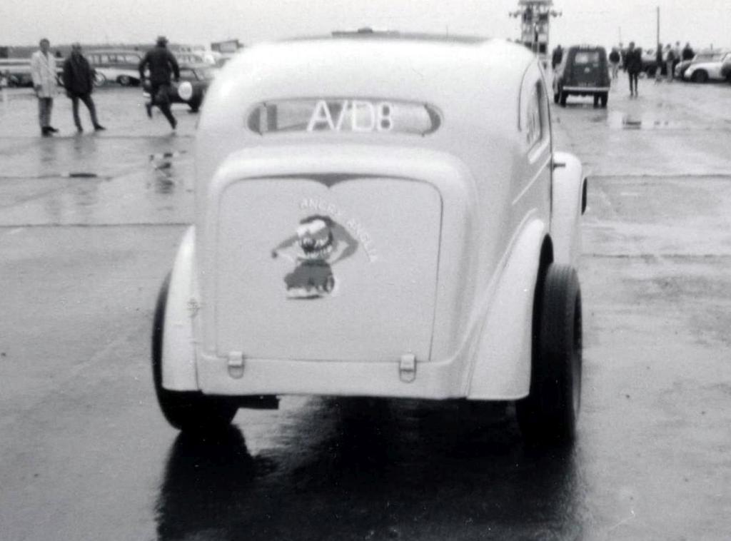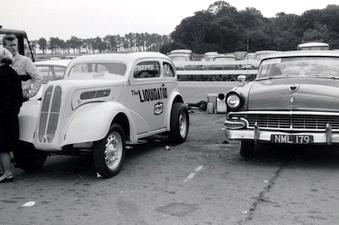 Our first meeting was the 1966 August Championships Meet. I used my 1956 Fairlane Victoria to tow the car with a fixed bar and when we came to a hump-back bridge in Newport Pagnell I slowed down and the rear passenger wheel came off The Liquidator and overtook me! Our fault, as we obviously didn’t tighten the nuts. Fortunately, there were no pedestrians there! We just hadn’t had the time to finish it, and arrived at Santa Pod without a firewall in the car. We knew we could not run but we just wanted to get the car to the track.