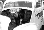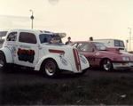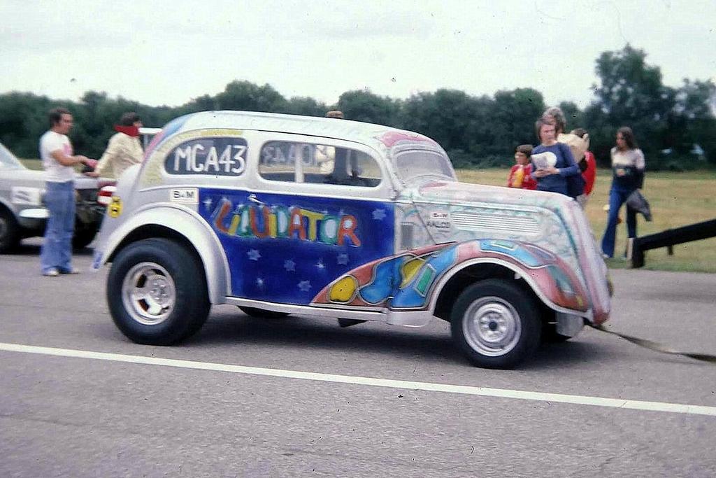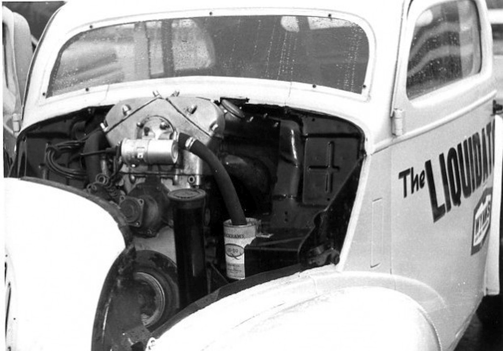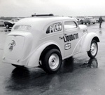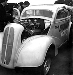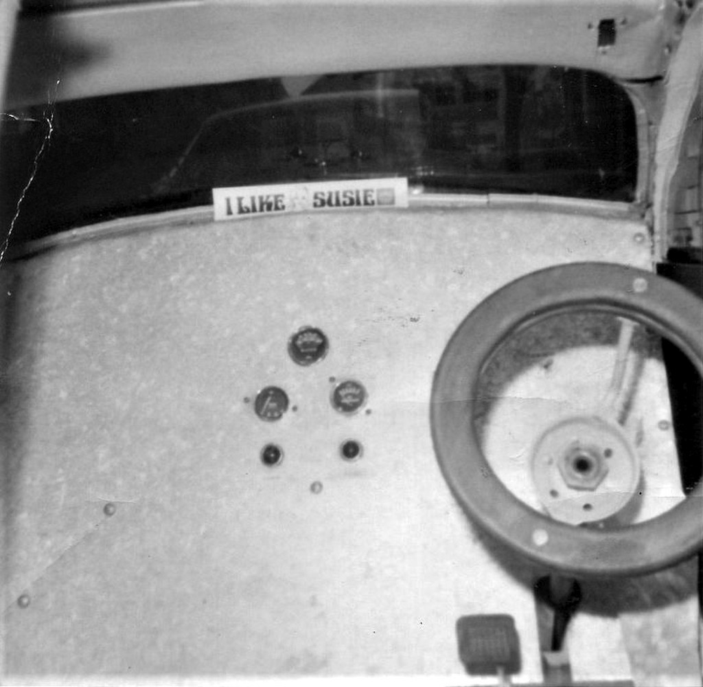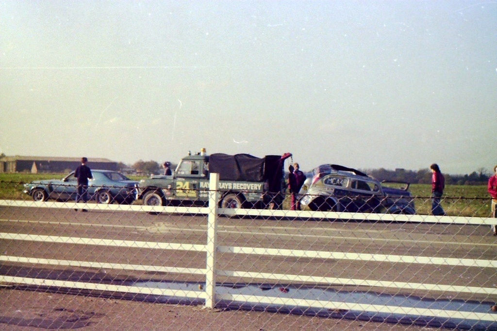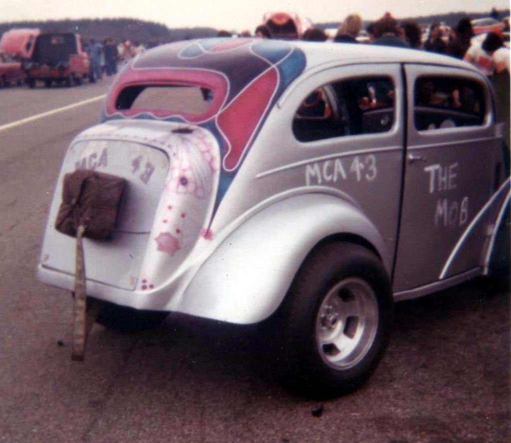 Our first meeting was the 1966 August Championships Meet. I used my 1956 Fairlane Victoria to tow the car with a fixed bar and when we came to a hump-back bridge in Newport Pagnell I slowed down and the rear passenger wheel came off The Liquidator and overtook me! Our fault, as we obviously didn’t tighten the nuts. Fortunately, there were no pedestrians there! We just hadn’t had the time to finish it, and arrived at Santa Pod without a firewall in the car. We knew we could not run but we just wanted to get the car to the track.