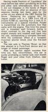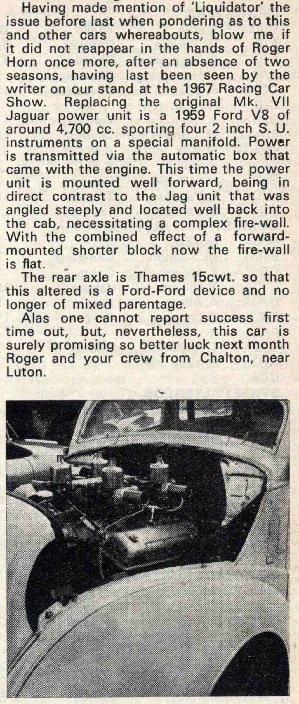 Now at 80 years of age I drive a Kia! I now live 15 miles from Victoria on Vancouver Island and spend my spare time restoring vintage tractors and also enjoy restoring my seven Atco mowers on our half acre. I have a Fordson tractor, a 1925 model which has the Model T engine developing 20HP. The Model A came out in 1927-28. This model tractor was made between 1917-28 and has a 4.1 litre engine developing 20HP @ 1000RPM. I have owned it for about 40years, however it is not easy to hand crank for an over 80-year-old! Now, every few months I remove the plugs, pour in some oil, and turn it over a few times. Possibly I will sell it over the next few years. At 80 years of age the Fordson is getting tough to start......just like me! Norman Barrett... After Geoff emigrated to Canada, I took his place in the team and carried on running Liquidator from 1967 onwards. In 1967 myself, Mick and Roger decided to replace the Jag engine with a 292 inch Ford Y Block. This must have taken all of 1967 and a lot of 1968 because we didn’t run the car until October 1968 and again in November 1968. I will need to rack my brains to recall more about this period and details such as what gearbox we used. Roger Horn drove the car for the two meetings at Santa Pod in 1968. We didn’t enter the car for any more race meetings after that and the car was eventually sold, the details of how and when this happened, I can't recall at present.