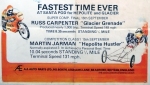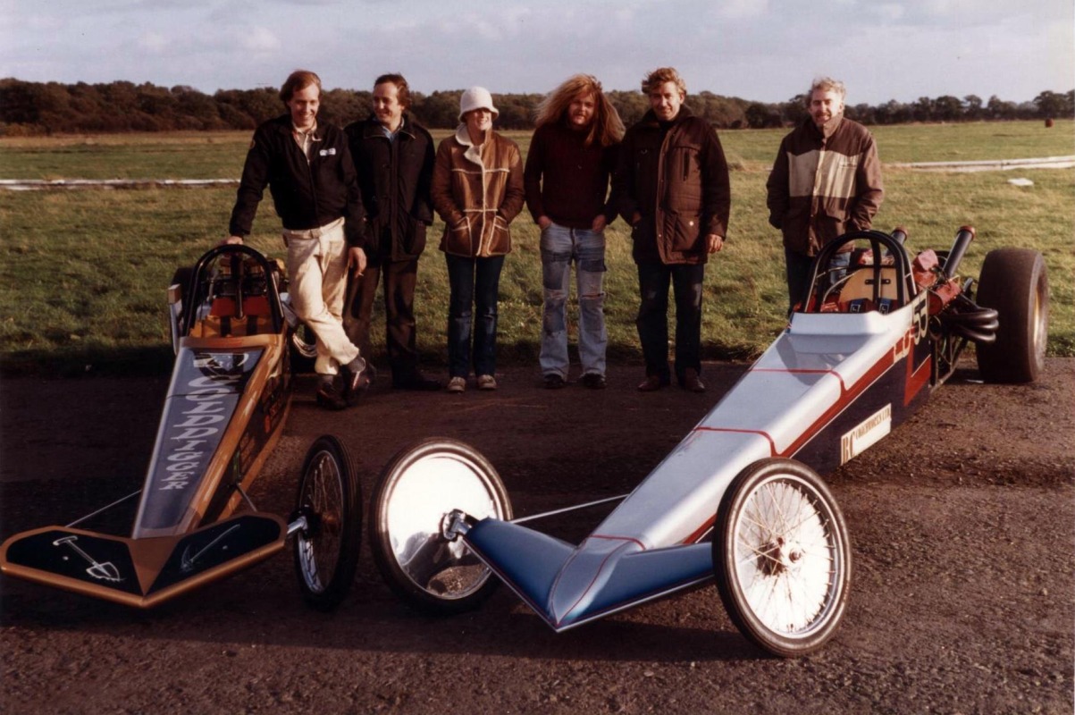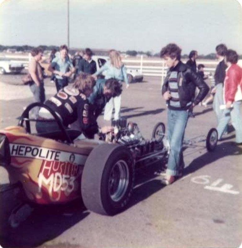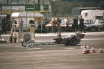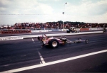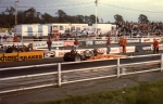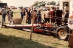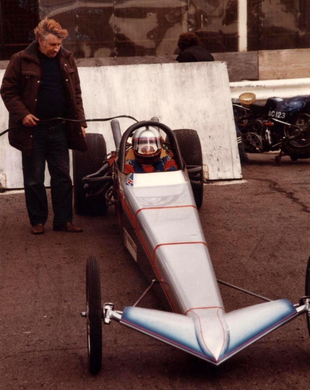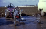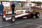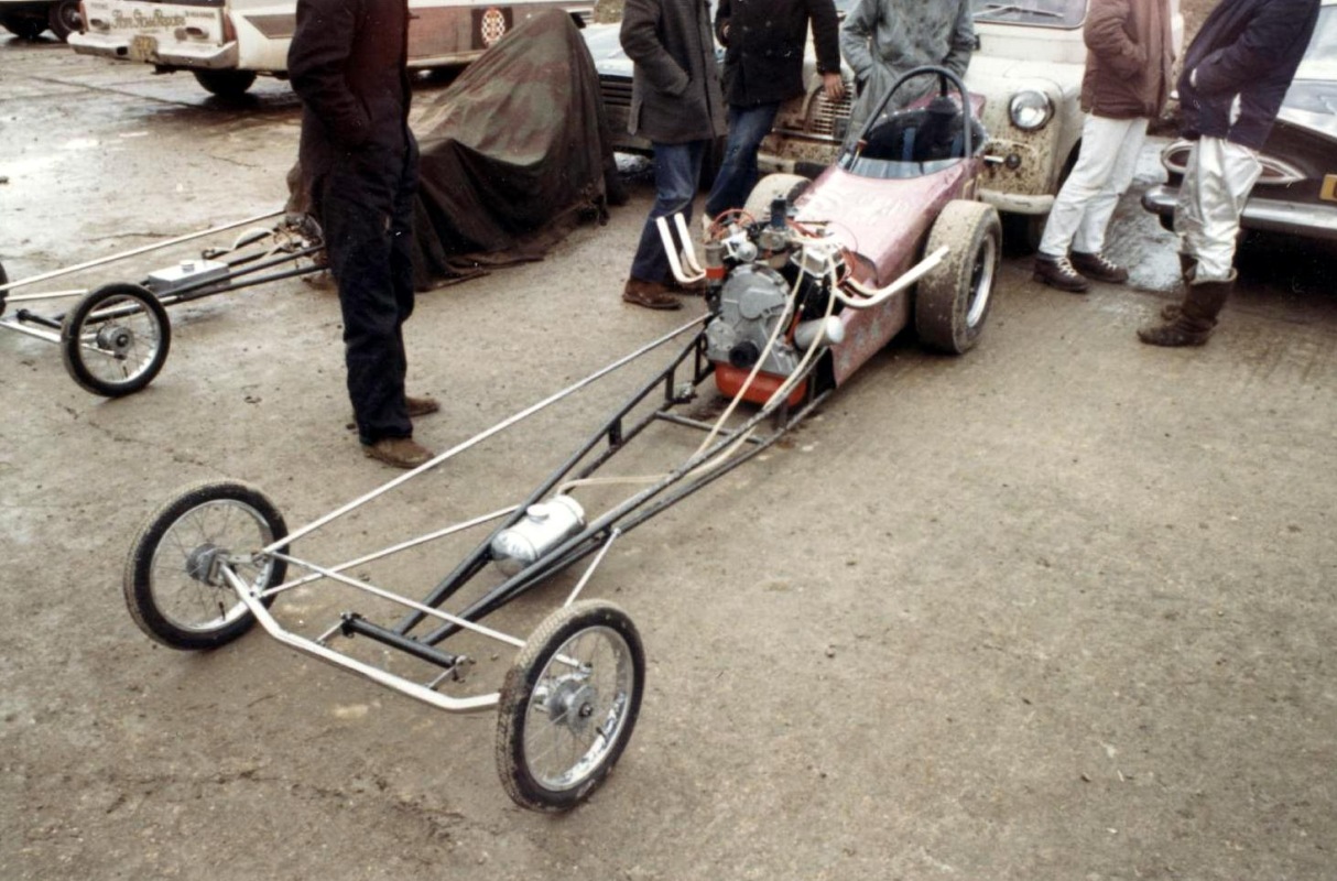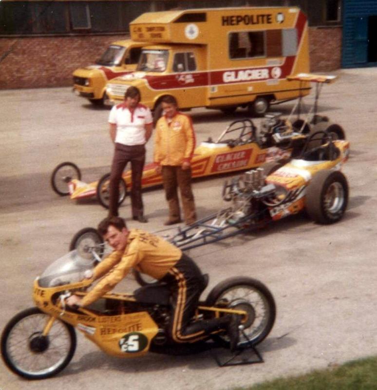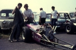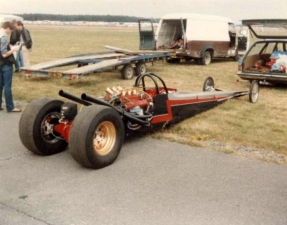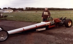 In 1976, John Hunt saw our dragster on the trailer on the road outside Martin's house. John lived only a five minute walk from Martin's. He ended up going round to the garage many times during the next five years, coming with us to meetings at Blackbushe, Santa Pod, Snetterton, Wroughton and York Raceway. We offered John a drive on the back roads at Snetterton; being too nervous about something might happen he declined. I would drive at Santa Pod, Martin would drive at NDRC events. In 1976 we attended just six events at Santa Pod, setting up the new combination. In 1977 on 17th April at Blackbushe Martin won against John Whitmore, running 11.34/112mph. On 15th May we went to Mantorp Park, Sweden with a group of racers (see photo) Although being knocked out early we ran a personal best of 10.80. I drove six events at Santa Pod then Martin ran two more at Blackbushe, one at Snetterton and one at Wroughton. Martin won the NDRC Middle dragster Championship that year. I repainted the dragster in yellow and red during the off season. Martin acquired sponsorship from Hepolite & Glacier pistons and bearings for 1978, renaming the dragster 'Hepolite Hustler'. In 1978 our first meeting was also the first meeting at Radlett on 1st May. With another crown wheel and pinion fitted, I wanted to try the car around the back roads. I pulled a big wheelie straight away, bending the front axle enough to not to be able to enter the competition. I seem to remember the meeting was rained off not long after we headed home. After this, we extended the chassis and fitted a wheelie bar. Back out on 21st May at Blackbushe, Martin was runner up to Ken Penfold, then 3rd/4th June at Snetterton, Martin was runner up to Steve Collins, August 13th runner up to John Whitmore, then 9th/10th Snetterton, winning against Ken Penfold Blackbushe and on 24th September runner up to John Whitmore. I drove at four Santa Pod events. Martin won the NDRC Middle dragster Championship in 1978, his second in a row.