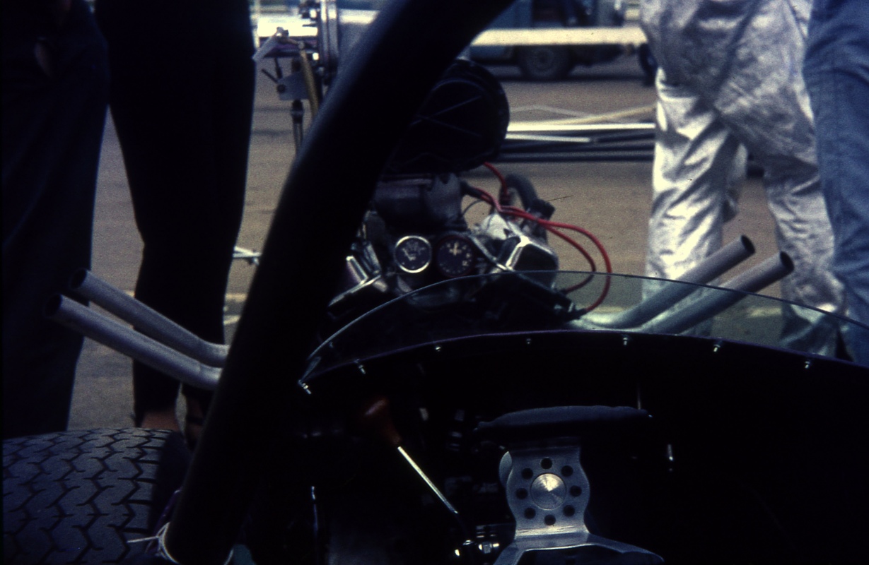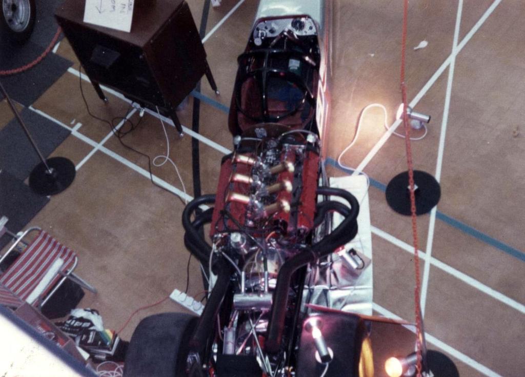 My brother Martin became involved with me after my last race of 1975, Blackbushe on 5th October. We decided to build a V6 Ford 3 litre injected engine and extend the chassis at the same time. After having kept the dragster at Farncombe before this time, we used Martin's garage at his house in Raymond Crescent, Guildford Surrey. We used the Ford 2.5 litre bowled pistons, keeping the standard V6 crankshaft and taking 100 thou of the top of the pistons to raise the compression ratio to 17 to 1. We used fully floating pistons using teflon button end caps, and made copper head gaskets with O rings, installed a Piper camshaft, using the all fibre timing wheel gear driven by the crankshaft. A Tecalemit and Jackson Injection system was purchased from Blackburns at Chiddingfold, Surrey. Running just methanol, we added Propylene Oxide recommended by Peter Billinton of G Max Fuels, this kept the engine clean. The valves would quite often touch the pistons without doing any damage.