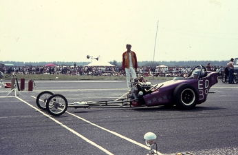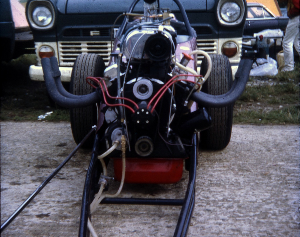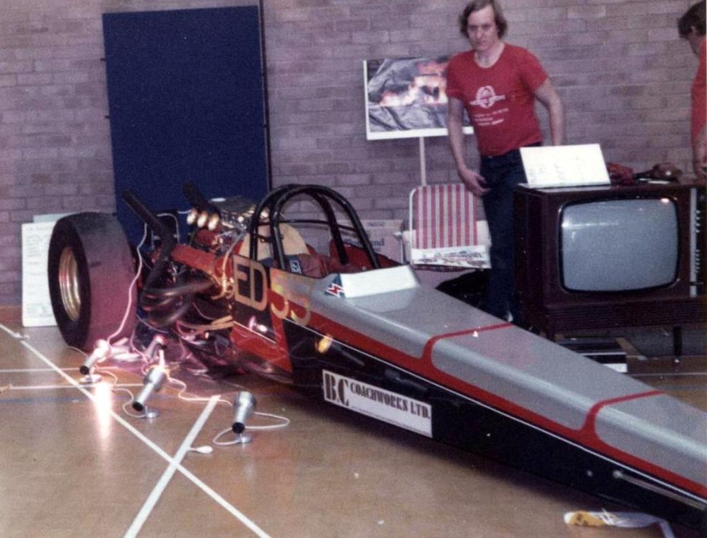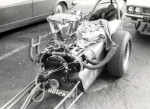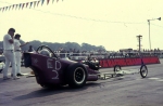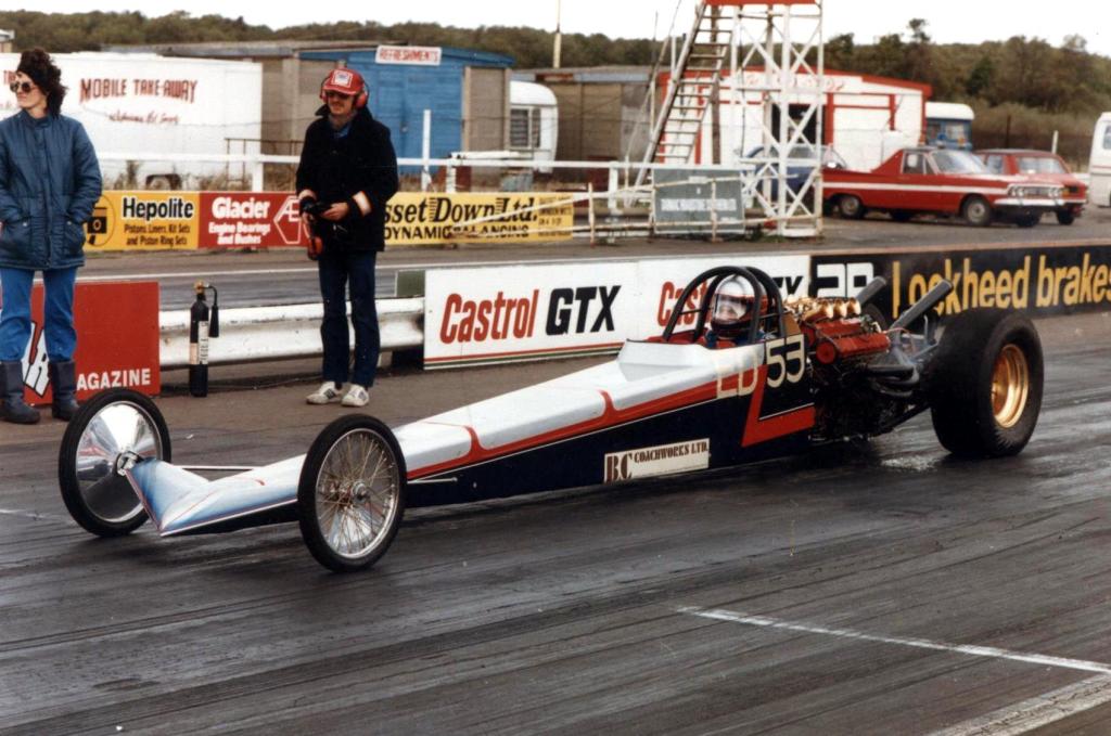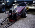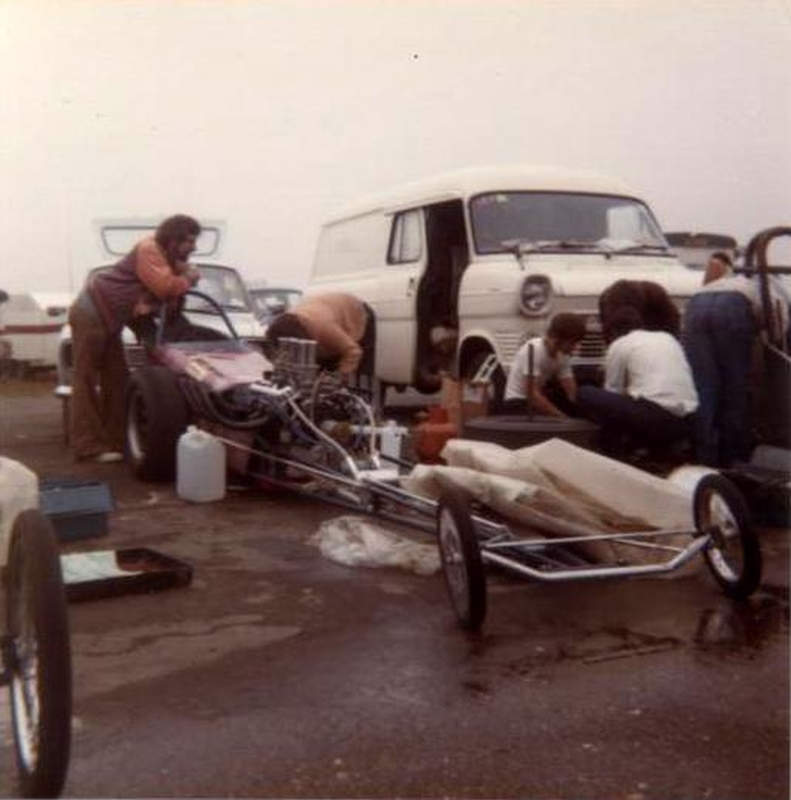 I did not race again with 'Strip Star' ED2 until until 19th August 1973 at Blackbushe then 2nd-4th November 1973 at Santa Pod. Then in 1974, I entered four events at Santa Pod, two at Silverstone, one each at Long Marston and the first event held at Snetterton. In 1975 I started a repairs and spray painting business called Shere Coachworks at Farncombe. I would paint two of Bill’s dragsters. I entered two events at Santa Pod, three at Snetterton and Blackbushe and one at Wroughton, winning against Ken Thorpe, the new driver in Pub Crawler 12.65/100mph at Blackbushe 13th April. I ran several induction setups with the V4 in Strip Star from 1969-1975 including a single carb, fuel injection and also I ran it blown and injected.