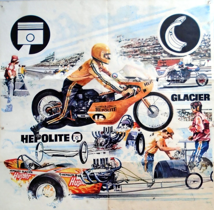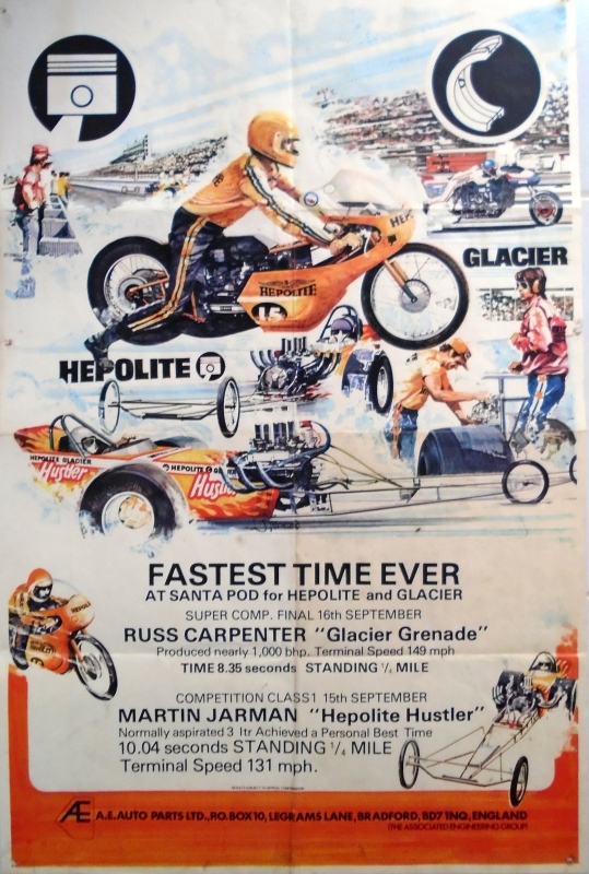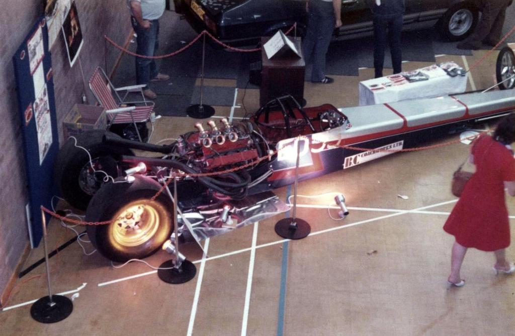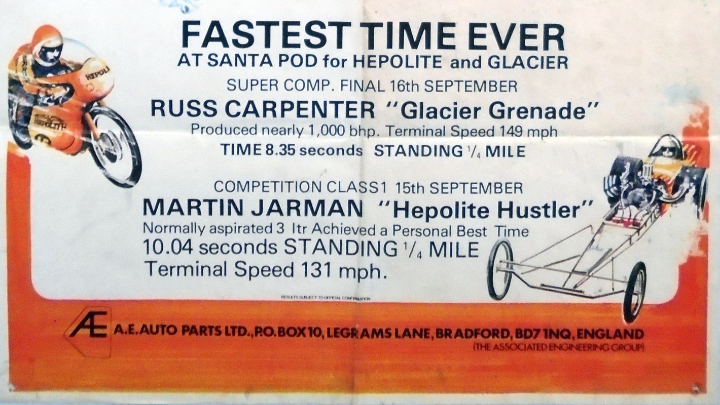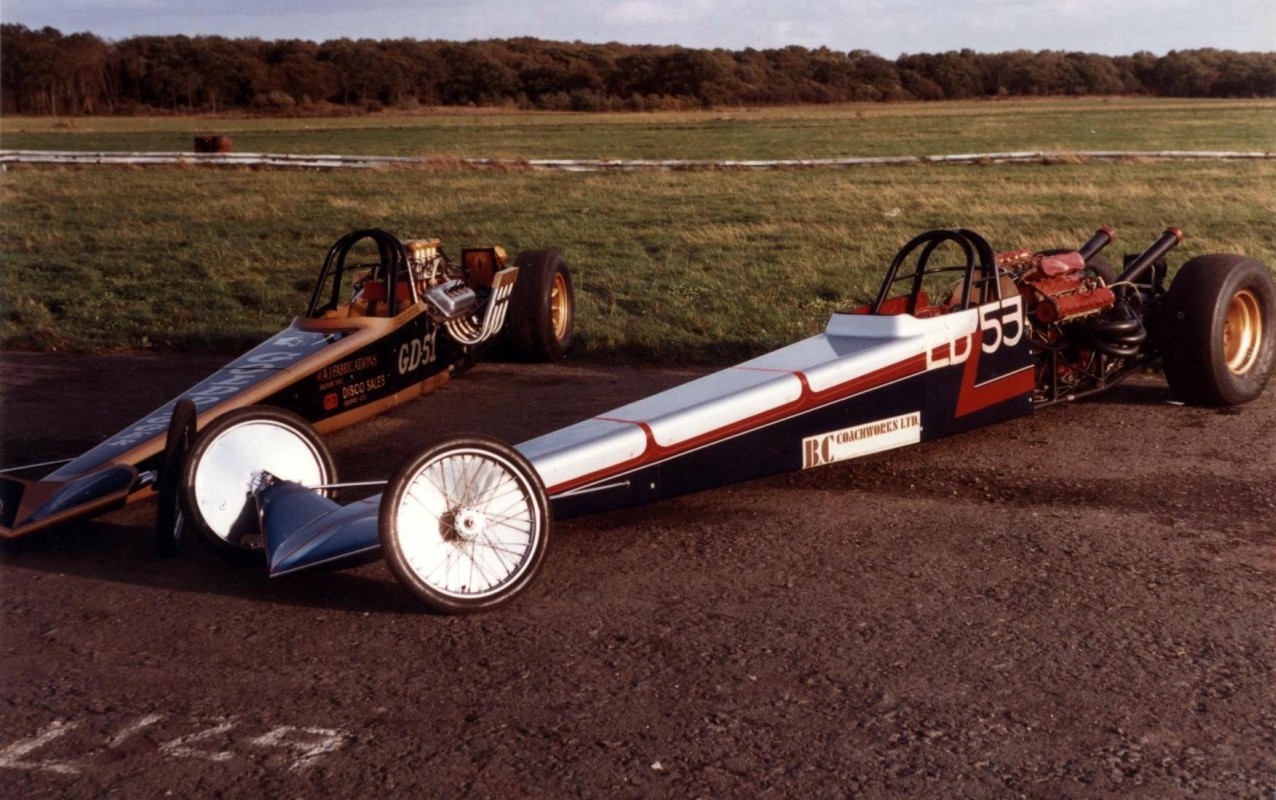 I did not race again with 'Strip Star' ED2 until until 19th August 1973 at Blackbushe then 2nd-4th November 1973 at Santa Pod. Then in 1974, I entered four events at Santa Pod, two at Silverstone, one each at Long Marston and the first event held at Snetterton. In 1975 I started a repairs and spray painting business called Shere Coachworks at Farncombe. I would paint two of Bill’s dragsters. I entered two events at Santa Pod, three at Snetterton and Blackbushe and one at Wroughton, winning against Ken Thorpe, the new driver in Pub Crawler 12.65/100mph at Blackbushe 13th April. I ran several induction setups with the V4 in Strip Star from 1969-1975 including a single carb, fuel injection and also I ran it blown and injected.