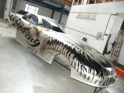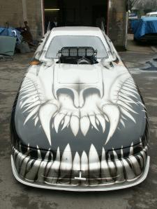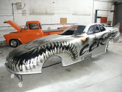 After we got the car in October we bare-metalled the chassis, said Andy. That took a couple of weeks. We adjusted the front suspension, we changed the fire extinguisher system, and we had a major job to change the rear axle. Its a Strange Engineering Toploader rear axle which came from the Showtime team. We had to convert from a 3.20 to a 4.30 rear end which involved machining the case. We had to call Strange Engineering several times whilst we did that! Cliff gave us the lowdown on the spectacular bodywork. It's taken us from October until this week, he said. We rubbed the body right down to the base, and made various repairs including dealing with oil which had seeped into the body. Doug then laid the primer and prepped the body. The base coat of silver was laid by John Sultana of BBR, who also did Rob Smallworth's car and Andy Oliver's Camaro. Alan Booker designed the artwork and then applied the design. The lettering was applied by Andy the Signwriter who has done all of CC Racings work. As you can see, it was a lot of hard work but the results were worth it.