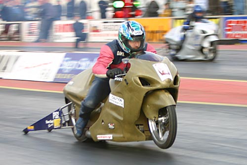 Dave Beck: 7.295 at 183 mph, making it the fastest Pro Stocker in Europe and the fastest ever to have competed at Santa Pod. This isn't an official European record as it was set at a National event, but I hope to reach that goal if sponsors can be found to fund the two FIM events at Santa Pod in 2004. Eurodragster: Who is your current crew? Dave Beck: My new wife Charlotte, Mum and Dad, Rich Fielding and Andrew. Many thanks to them for making the success of recent years all possible. Eurodragster: What plans do you have for the future? Dave Beck: We're always improving the bike, whether it be Roger making another tiny but crucial mod to the motor, or another small tweak we've learnt from the last run. For 2004 the major (visible) changes are a complete new dual disc front end, plus carbon/kevlar TL1000 bodywork. And this year I promise to have a complete paint job! But the real goals are to keep resetting the European marks - I'd like to run into the seven-teens early in 2004 and look to join the 7.0 club before year end. Ultimately, a six-second run would have to be the goal. Eurodragster: What is your favourite story/moment involving the bike? Dave Beck: Being the first Pro Stocker to break into the 7.2s and 180s. Bagging a sixth ACU title recently, after missing two rounds - there's nothing like the buzz of securing a title on the very last run of the season. Eurodragster: What is your favourite story from the pits? Dave Beck: I got married in November, and for some reason my mind's gone blank on this question! Eurodragster: What do like most about the sport? Dave Beck: Almost too many to mention: the speed, the adrenaline, the rush, taking the win light; the comradeship amongst all the competitors; and the sense of adventure every time I set off to another race - this sport always has something new to offer.