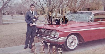 Grady: Back in ancient history in New Mexico, when kids hung fuzzy dice on their mirrors, I had a friend named Dick Harrell. He had been playing around with hotrods for years and I was a bystander. I wanted to get involved and bought a new 1961 High Performance 396 Chevrolet. Dick bought a 409 Chevy. That way we would not have to run in the same class. After a few modifications of the electrical systems and the carbs, we started attending all the races we could in the region of New Mexico, Oklahoma, Arizona, and Texas. We had no one to travel with us (Carlsbad, New Mexico was in the middle of nowhere), so we decided that if we pulled with a chain instead of a tow bar we could make faster time and eliminate using another car. Plus, it was cheaper if we split the gas. I know it sounds crazy, but we would pull 400 to 500 miles in a week end by using the chain. Dick was always the front car with the 409 and I was the brake car. We would run what they then called Super Stock with the 409 and A/Stock with the 348. We would carry our racing third members in the trunk, and when we got to the race track, up went the car with a bumper jack and we would change the rear end so we could race. When the race was over, we had to change them back to our cruising gears. At one race, Dick broke a transmission and we used mine for him to race and then pulled it out and put it in my car for me to race. This worked pretty good until it was time for us to race each other. Someone loaned us their transmission for the finals. I believed we changed transmissions about a dozen times that Sunday, plus the rear ends for our trip home. It wasn't a sport for weaklings, or for someone who fell asleep easily. Many times we would get home just in time to go to our jobs without any sleep for the weekend. But, if you wanted to race (and we did), this was how it was going to be.