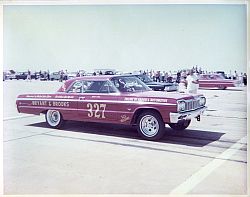 Grady: My old friend Dick Harrell, and Fred Gibbs, were instrumental in getting those cars built by Chevrolet to run pro stock in AHRA. They were aluminum big block 427's. Mine was shipped to Harrell's shop in Kansas City where it was turned into a real race car. It had a clutch hooked up to a turbo transmission. Worked pretty good too. We did match race it a lot because NHRA didn't have a Pro Stock class at that time. The first time NHRA had a Pro Stock race was in Dallas, Texas. There was no rules written for them so we took advantage of it and showed up to run all the factory cars from Chrysler, with no radiator, etc. We just asked for them to show us the rules on Pro Stock, of course they couldn't. It was a very exciting day, fighting with all the Chrysler boys. Needless to say we made a lot of people mad, but Chevrolet loved it.