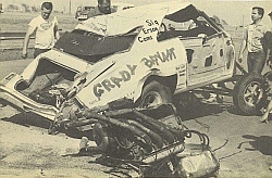 Grady: We would run as many as we could book. Sometimes as many as three a week. Back in those days there were tracks in the South that ran Thursday, Friday, Saturday, and Sunday. Many times we would run Saturday night and have to drive 300 miles to get to the track Sunday. That was the era when every one took the little pink pills to stay awake, we had to. Eurodragster.com: What type of rig did you have for the car and did you ever have any incidents with it? Grady: If I remember right it was a 60 Series Chevrolet truck with ramps, courtesy of Ferrill Chevrolet. Large metal boxes were attached to the sides which we carried spare parts. There weren't many spare parts back in those days. Chevrolet was furnishing us parts but it was a long process to get them. One night we were coming through a little town in Mississippi when I turned a corner and the box door on the side came open. It was the side we carried the tools in. The complete tool box and all the tools came out and slid down the road, we picked up tools for hours. Eurodragster.com: What volume of spare parts did you have for the car and how did you avoid changing a motor every run like they do now? Grady: Remember, the cars were injected back then and not blown, which was easer on parts. At first we used special cranks and pistons from the well known manufacturers in California. We had to pay for these ourselves. Chevrolet furnished parts but only Chevrolet parts. If we cut down on the percentage of nitro we used we could get by with stock parts, which saved us money in the long run. On some runs, like a final, we would load it up and I would hold on for the pop at the other end. Some times it came and sometimes we got by with it. Our biggest problem was starting the car. If a Chevy did not start immediately we had to take out all the plugs and spin it over to get out all the nitro, if not it would pop right there in the starting lanes and come out through the oil pan. Some of the guys got their feet injured by rods coming out.