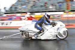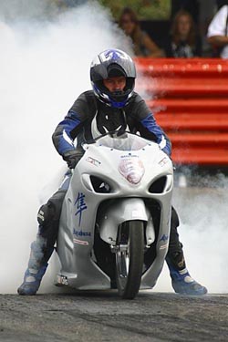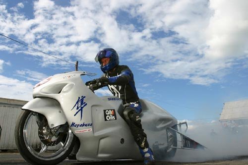 Grumps: Robinson Race Cars and Paul Willis. Eurodragster: What is the powerplant and who built it? Grumps: Suzuki 1500 GSX originally built by Paul Willis and Dom, now in the hands of the master - Roger Upperton. Eurodragster: Approximate BHP? Grumps: At a guess around 300bhp. Eurodragster: What drivetrain does the bike employ? Grumps: It was originally a Vance and Hines six-speed, but now we run an Orient five-speed. Eurodragster: What is the bike's race weight? Grumps: 600lbs with rider. Eurodragster: How the bike has developed since you first got it? Grumps: Well, we had a hard time with the datalogger at first, and once we sorted that we then had a bogging problem for a few meets! I still feel like I am learning how to ride the bike. Eurodragster: Best elapsed time/terminal speed? Grumps: 7.62/175 Eurodragster: Who is your current crew? Grumps: Kim Sawle (Pixie) and Kev Simmonds: the best crew I've ever had, they are totally dedicated. A big thanks to Dave Beck as well. Eurodragster: What plans do you have for the future? Grumps: A paint job would be nice (any offers!?!) and possibly a new Upperton engine. A new datalogger is also planned.