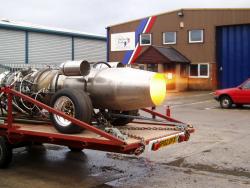 I asked Ian's wife Sue what she thought of the prospect of her husband strapping himself into a Jet Dragster. "It's something he's always wanted to do - he wants the speed rush!", said Sue. "I'll be there at the track to make sure that everything is OK, as long as I get a nice colour co-ordinated jumper!" For the engine tests Ian had the help of tractor puller Chris George who has three ex-helicopter turbines on his tractor. "Chris has commitments on the tractor pulling circuit next year but he will be crewing with me when he can", said Ian. "He has been very helpful indeed and his experience is invaluable. I knew nothing about jets before I started this project - I didn't even know where the fuel went in!" The engine had been started twice previously; once on a test stand and once a couple of evening previous to our visit. "We ran it up briefly on Thursday", said Ian. "There was some air in the system but it went OK - except for the people in the call centre across the road, they had to stop work!" The plan for the day was to fire up the engine, to try to light the flame show, and to open the afterburner but not light it. For the purposes of the test a remote control panel was wired into the jet which would allow Ian and Chris to stand alongside the car, which was on its trailer and very securely tied down. The jet was towed out of Ian's industrial unit and lined up in the car park. Supertwin Fuel racer Steve Clutterbuck - who spent his career working on jets such as those for Concorde - was present to help as was Wild Bunch racer Chris Hartnell, his partner Claire Meaddows and son Lee.