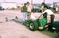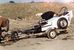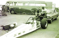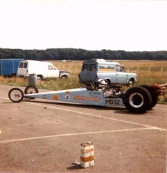 Eurodragster.com: Did you have partner or crewman helping at the track and in developing the car? John Whitmore: Ken Bonham did loads of machining for me, made a flywheel and other drive components and came to the strip to help. He was a character, always jolly and happy and the life and soul of the party. I later worked with Paul Claricoates who I am still in touch with as he lives in the outskirts of Leicester, and Shirley Ayre, who is now in Canada. Eurodragster.com: How did you meet Paul Claricoates? John Whitmore: I first met him in about 1968 or 1969. A friend of his said to him he knew a chap who was building a dragster and did he want to see it. He said yes without having a clue what it was as he had never heard of one! But as it had wheels and an engine he was all ears, as he said he had been messing about with spanners since he was big enough to hold them. I had a lock-up near my house; Paul only lived about a mile away and was keen to get a bit more involved if he could. He would call in at my lock-up in the evening when the light was on to see how I was getting on. My first chassis was hanging in the roof. It had failed scrutineering because something at the front wasn't strong enough, so I was rebuilding the car with a new chassis. One time after a few visits Paul called in, and I asked him if he could help me with something, so from that point on he started coming round more often and helping me, just with bits and bobs. At some point in 1971 or 1972, I said Paul should go and see some drag racing, so Shirley (his young lady) and Paul went to RAF North Luffenham to see their first drag race, which they both thought was great. They then went to Santa Pod and got close to the track at the top end as well. Eurodragster.com: How did Paul and Shirley become regular crew? John Whitmore: At this time my parents went to help me, sometimes when my mother didn't go I would give Shirley and Paul her ticket and they went and helped out. When my parents gave up going I would give them both tickets and they became full-time pit crew, and would come round to my lock-up most Wednesday evenings to help with what they could. Between 1972 and 1980, Shirley and Paul went to most of the meetings. Apart from general help in the pits, Shirley became the main push car driver and Paul sorted me out on the start line. On one occasion I covered Paul from head to toe in bleach down one side doing a burnout while he was walking round the back of the car to put bleach down in front of the other wheel, he bent my ear about that afterwards! Eurodragster.com: What was your main engine type then and did you have special parts? John Whitmore: I started with the early A series from the Minor and A35 and later went to the Cooper S type engine. The block was the same, but transverse.