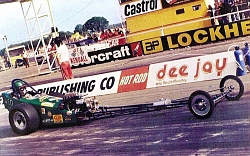 John Whitmore: On one occasion it when it was cold weather, the front engine car wouldn't start well. I had a bye run and I did a wheelie in the dragster, then after it came down I hit the throttle and it came up again. I took my foot off the throttle and it came down again. The dragster was moving across into the other lane and by then as it was tipping onto one wheel. I hit the throttle a third time and the dragster went right up into the air on one wheel. After the run Stu Bradbury came up and gave me a bollocking for crossing the centre line, but, he actually ended up saying "It was pretty spectacular, that was!". I once had a match race against Dennis Priddle. When he was in the lane next to me I couldn't even hear my own engine, as the noise of his car was so loud: I couldn't judge my revs, I didn't have a rev counter. I didn't stand a dog's chance of winning the race it was a joke! Potentially it was an expensive race for Dennis! Eurodragster.com: How did you get backing from British Leyland? John Whitmore: Brian Taylor was trying to promote the sport and he talked to BL Special Tuning. BL agreed to sponsor me for my first rear-engine car. BL came on board after I started running eights at over 150 mph but sadly they only sponsored for one year. BL gave me money if I won, so it was a shame I did not win more often. It took a lot of work and best part of a year to get the rear-engine dragster running better. Eurodragster.com: How did the move to Daimler power happen? John Whitmore: The Daimler came about when I met a guy called Alan Sharpe. Alan worked with Gerry H Nolan who dealt in Jaguar spares. I became friendly with Alan and Gerry. They had some aluminium V8 Daimler engines, and kindly gave me one of them, along with sponsorship For the gearbox, they gave me a bigger Borg Warner Model 10 Jaguar gearbox which was the same as the Type 35 gearbox, but bigger, and modified it the same way. I also had to build a new chassis and fit a Jaguar back axle.