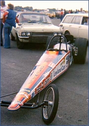 John Whitmore: I went to a reunion at Shakespeare County Raceway and saw Harold. I saw Stripduster and thought "I can make a car like that". But it took me a long time to beat him. Eurodragster.com: In 1974 you built a rear-engined car, what was the major mechanical change to it? John Whitmore: I still had the A series engine in it and a two-speed gearbox out of the overdrive in an Austin A35 which worked well for a time but then it started knocking gear teeth off after two or three runs. I started in second and ended up starting in third but couldn't do much about it. Also I had slicks on the rear-engine car and that stopped tyre spin and put more strain on the transmission. So I got a different gearbox to replace the A35 one. I went to a scrap yard and got a Borg Warner Type 35 transmission. I didn't have a clue about how an auto transmission worked, so I took it to bits and found out how it worked, and then modified and shortened it. I got rid of the neutral clutch which shortened the tail, welded a spline shaft to one of the parts of the epicyclical gear, worked out what clutch worked what, made a little aluminium block with a rod in it to direct the oil, put it my own home-made casing, and made a manual three-position control valve to change gear. A 7½" friction clutch replaced the torque converter. The forward position was second gear, middle was first gear and rearmost position was third gear. It worked a treat and fitted the engine nicely. I used the oil pump that was part of it to pressurise the system. Eurodragster.com: Which tracks were you running at?