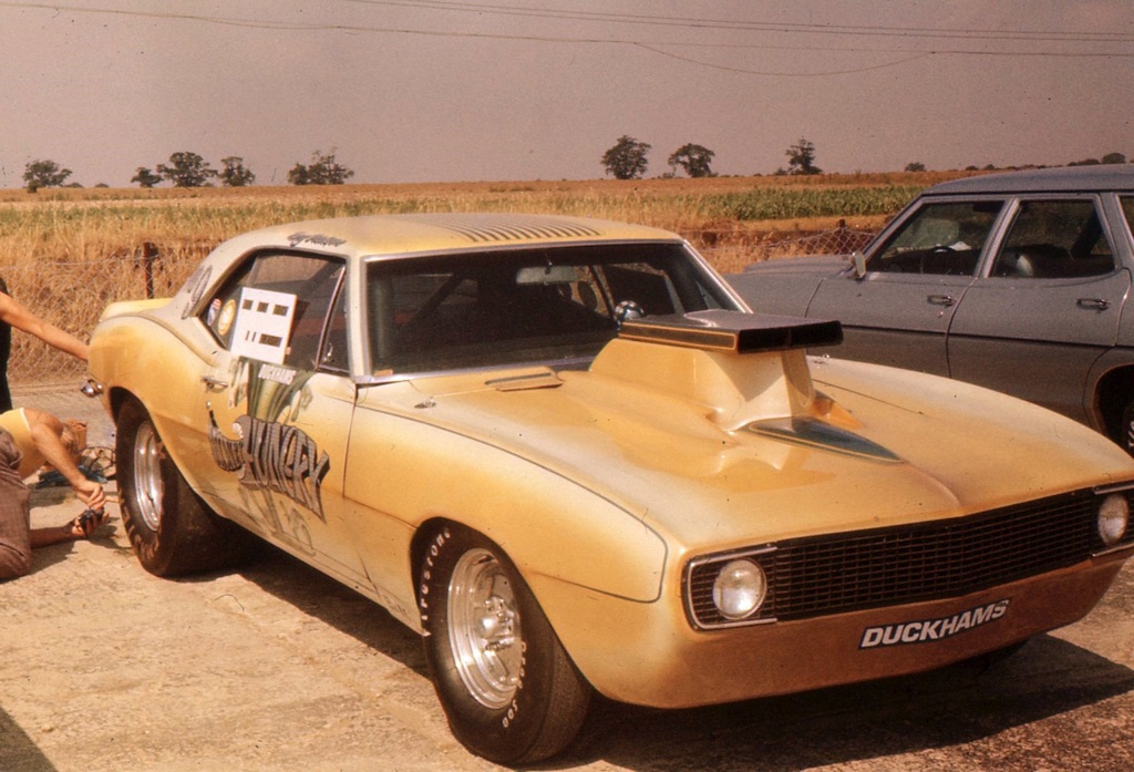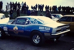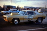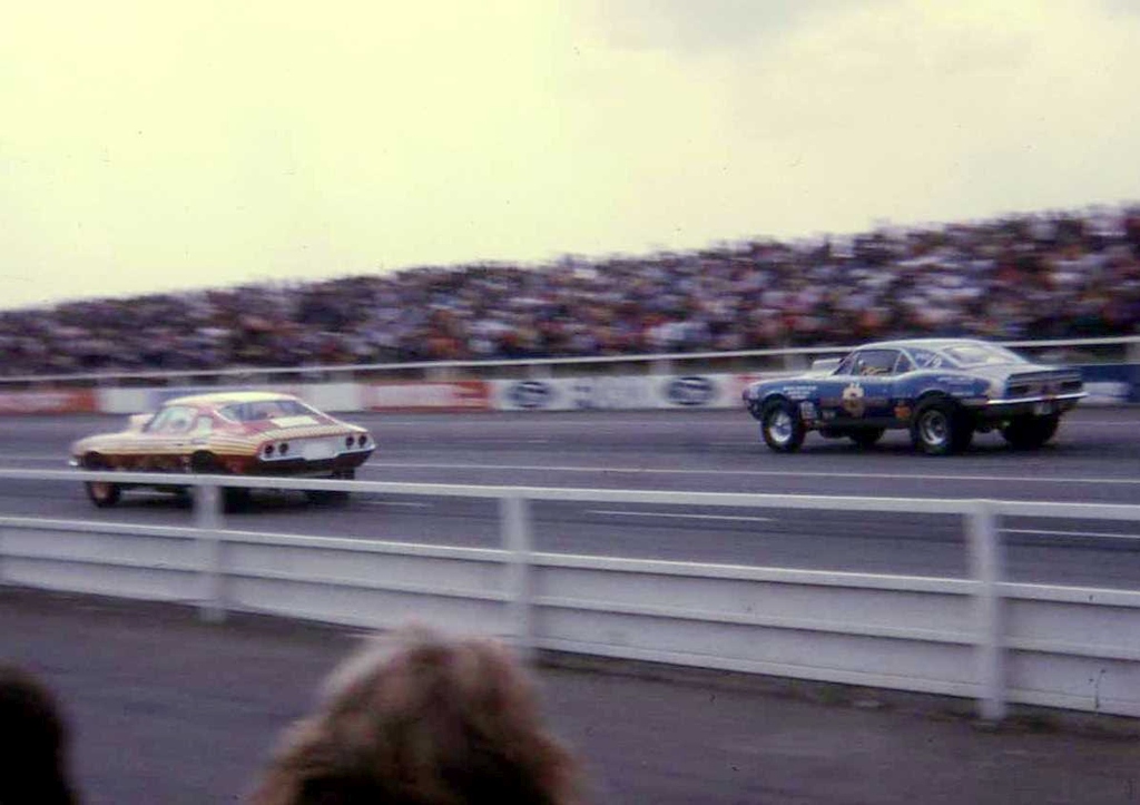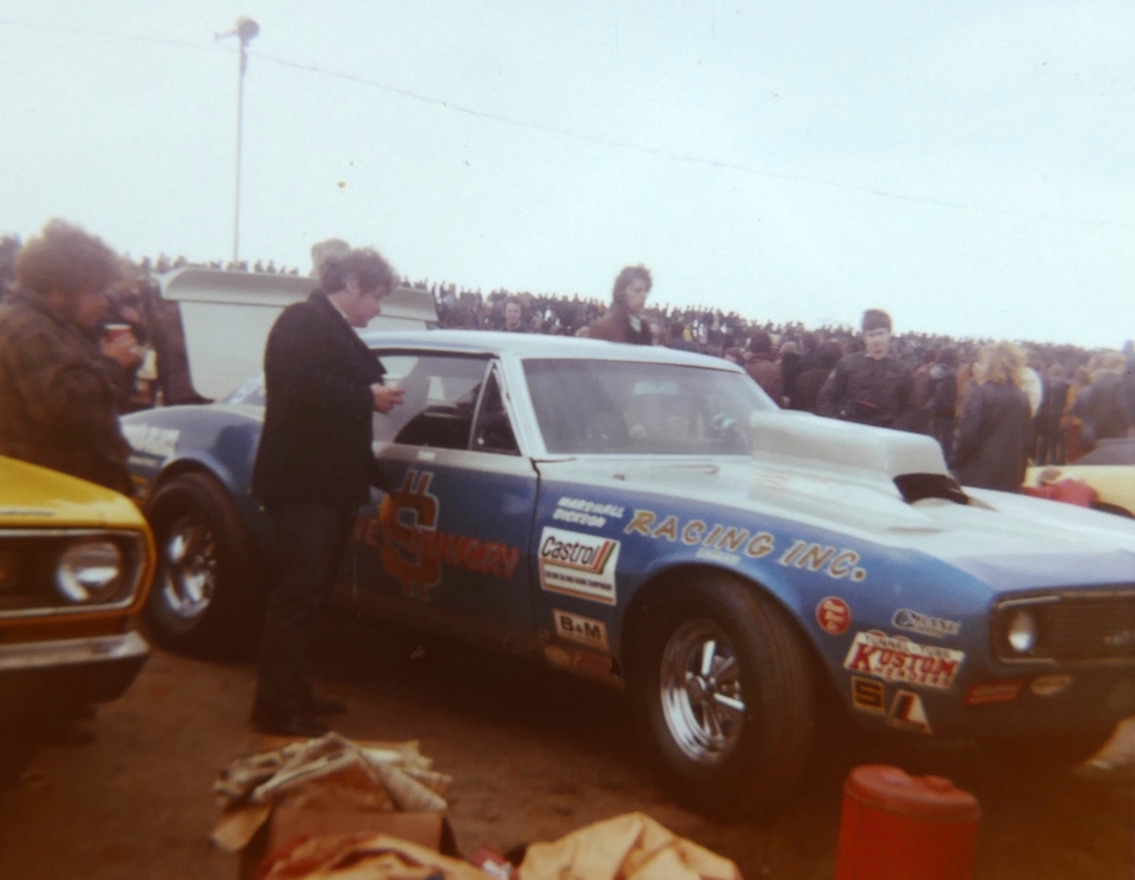 John Dickson: It took us about a year to get it back together and out there. The first paint job was red with a gold stripe around. We had it repainted by Phil Ritchie. We were tinkering about with the cars one day outside our house and he drove past in his E Type, saw what we had on the drive and stopped for a chat and we got to know him. He painted cars for a living and lived in Robertsbridge near us as we were in West Wickham. We ran it like that for two and a half years and the best time was 12.2/110 before the rebuild. About this time Tony had a 1958 Plymouth with fins as a tow car then he sold it and bought a 1964 Pontiac GTO. That was still a tow car but he started racing it. It would run fourteens at about one hundred miles an hour and he was quite successful in the Street class. We ran both cars between us and left the Anglia in the shed at SPR and rented some space from Ernie Braddick. Carol Ann was painting the fences and we did work at weekends as volunteers. Tony then decided he wanted to import something from the States to run as Pro Stock.