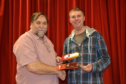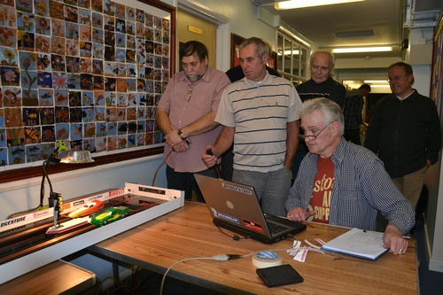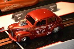 MrD Raceway Slot drag racing started in the UK not that long after the full-sized sport. Over the years it has not been unusual to find a slot drag strip at racing and custom shows, for example the Humberstone Drag Racing Club and Surrey Street Rodder tracks at the Custom Car and Brighton Shows and the Hull Street Freaks track at the Doncaster Custom Car Show. The latest slot drag strips to operate in the UK are MrC and MrD Raceways which hold events in Kent and Essex respectively. In January 2012 Eurodragster.com attended a meeting of MrD Raceway Slot Drag Racing Club and spoke to its founder and builder Steven Dudley (seated, above). Click on any picture for large version. Additional pictures below interview Eurodragster.com: How and when was your Club formed? Steven Dudley: After attending the MrC Raceway (Medway Rod and Classic Club) Slot Drag Racing and various slot car swap meets and shows since 2006 I decided that I didn't want to rely on just one track and the sporadic shows etc. In 2009 Jon Sutherland, the MrC organiser and track owner, offered me some polycarbonate roof sheeting which he had going spare in 2009 - this is what the MrC Raceway is made of. I accepted his offer and brought it home with a view to building my own track. A couple of guys from my Hot Rod Club the Rebel Rousers expressed an interest in Slot Drags and, following the completion of the track early in 2010, we set about trying to find a venue long enough to house the track. In September we located a school hall, the caretaker of which turned out to be a new member of our Hot Rod Club. To try to promote the track the informal Club was formed and planned to meet every month during the winter season. Peter and June Johnson, a profoundly deaf couple who have both been slot drag fans for some years, offered to build me a web site for the Club which is proving very popular. All we need now is for more people to get involved Eurodragster.com: Who built the track?