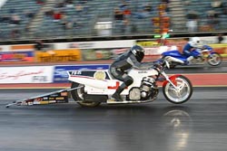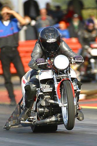 Sarah Jane: A 1500cc Suzuki GSX based Pro Mod Bike. Eurodragster: When did you acquire your current bike? Sarah Jane: May 2003. Eurodragster: Who built the bike originally? Sarah Jane: Jay Regan at MRE. Eurodragster: What is the powerplant and who built it? Sarah Jane: 1500cc Suzuki built by Jay Regan. Eurodragster: Approximate BHP? Sarah Jane: 230 bhp without nitrous, lots more with it! Eurodragster: What drivetrain does the bike employ? Sarah Jane: Five-speed peed Orient box Eurodragster: What is the bike's race weight? Sarah Jane: 600 lbs with rider Eurodragster: How the bike has developed since you first got it? Sarah Jane: As we haven't had the bike that long we have not really spent any time developing it yet, it's more been getting me used to riding the bike and Dave used to tuning it as it is very different from the old turbo bike. There is still more to come from the bike as it is currently. Once we have got the maximum out of the settings we have then we will look at developing it.