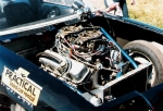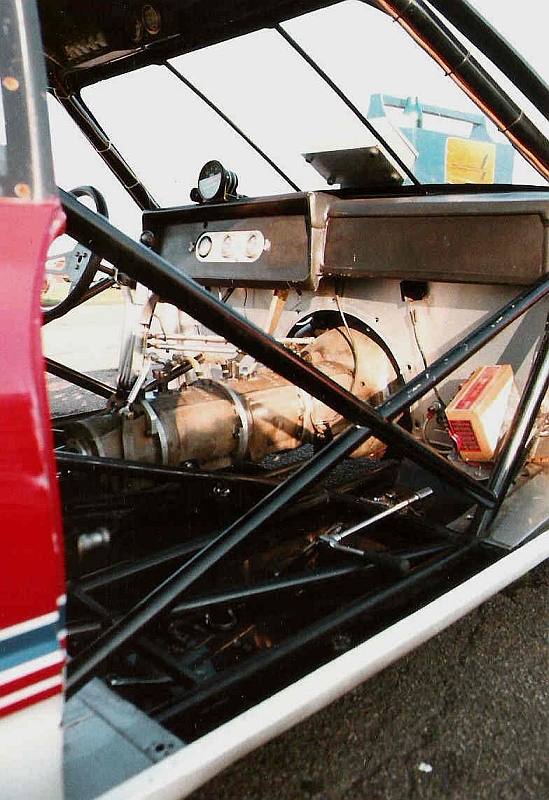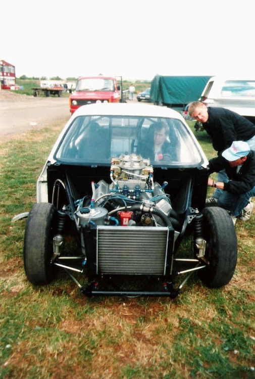 The engine was initially a 509ci BBC, but severe engine damage after a thrown rod at the car's debut forced them to plan B. This was the 427ci out of John Everitt's Camaro (ex-Dave Collis) which had crashed severely at Long Marston mid-1988. The engine was an all aluminium Can Am with a a 4-bolt mains block with ally internals. Carburettors were twin 1050 Holley Dominators with nitrous. Gearbox was a TH-400 to a Strange 9" rear axle.