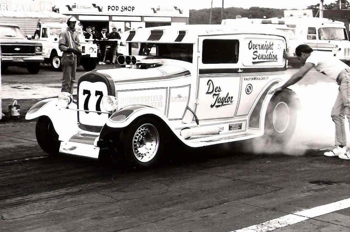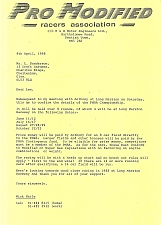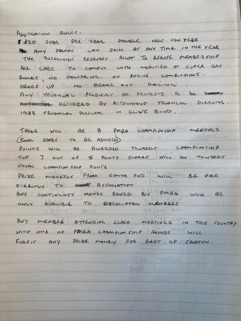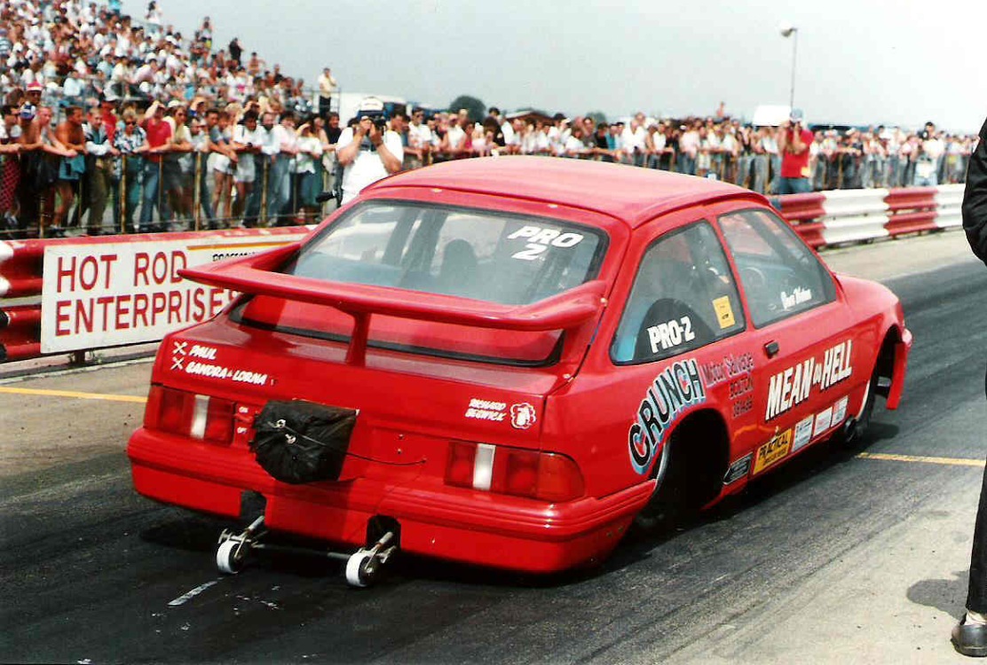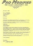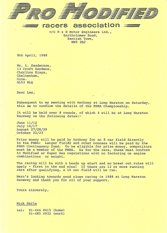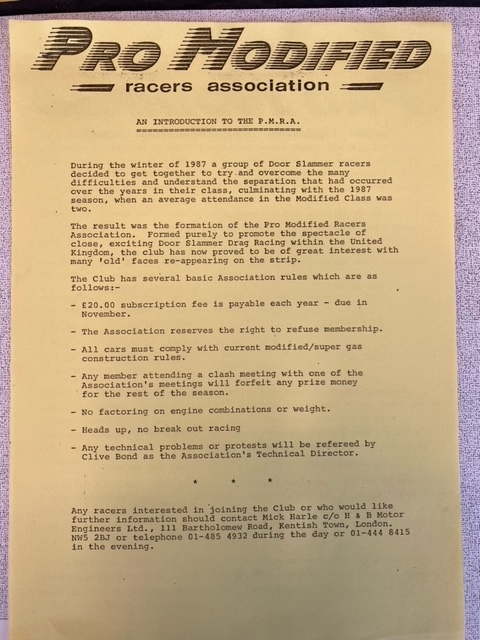 The racer credited with coming up with the title of Pro Modified was Mick Harle who was a member of Graham Barrs' Modified team. Mick had a role in organising the Pro Modified Racers Association and assembling a set of rules for the class. He recalls: "Top Modified in its handicap format had lost support to Super Gas and the number of cars had reduced to a couple. I floated the idea of a Pro class at the end of 1987 to both clubs so that enough Modified cars were able to race heads up for a decent purse. Eventually I did a deal with Roy Phelps that we were paid £1000 plus free entry for each race we did, with NDRA following suit. That lasted for a season however SPR's financial problems didn't permit Roy to renew the following year." Supporting the PMRA was an organising committee including Mick, Clive Bond (Ultimate Race Cars), Tim Cook and Geof Hauser with Andy Robinson joining the committee a short while later.