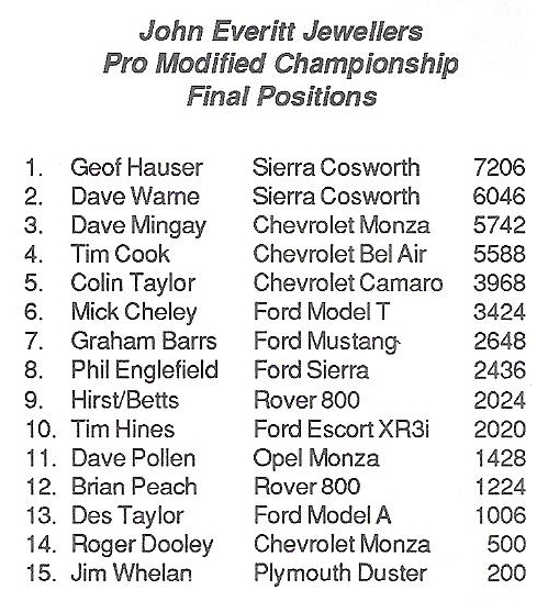 Contingency money for winners was also set up by Mick Harle, with the list including Mick's own firm H & B Motor Engineers, John Everitt Jewellers, Ultimate Race Cars, Americar, Chers Patissserie, Street Machine and Practical Used Car Rental.