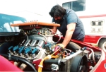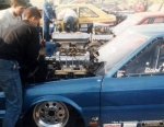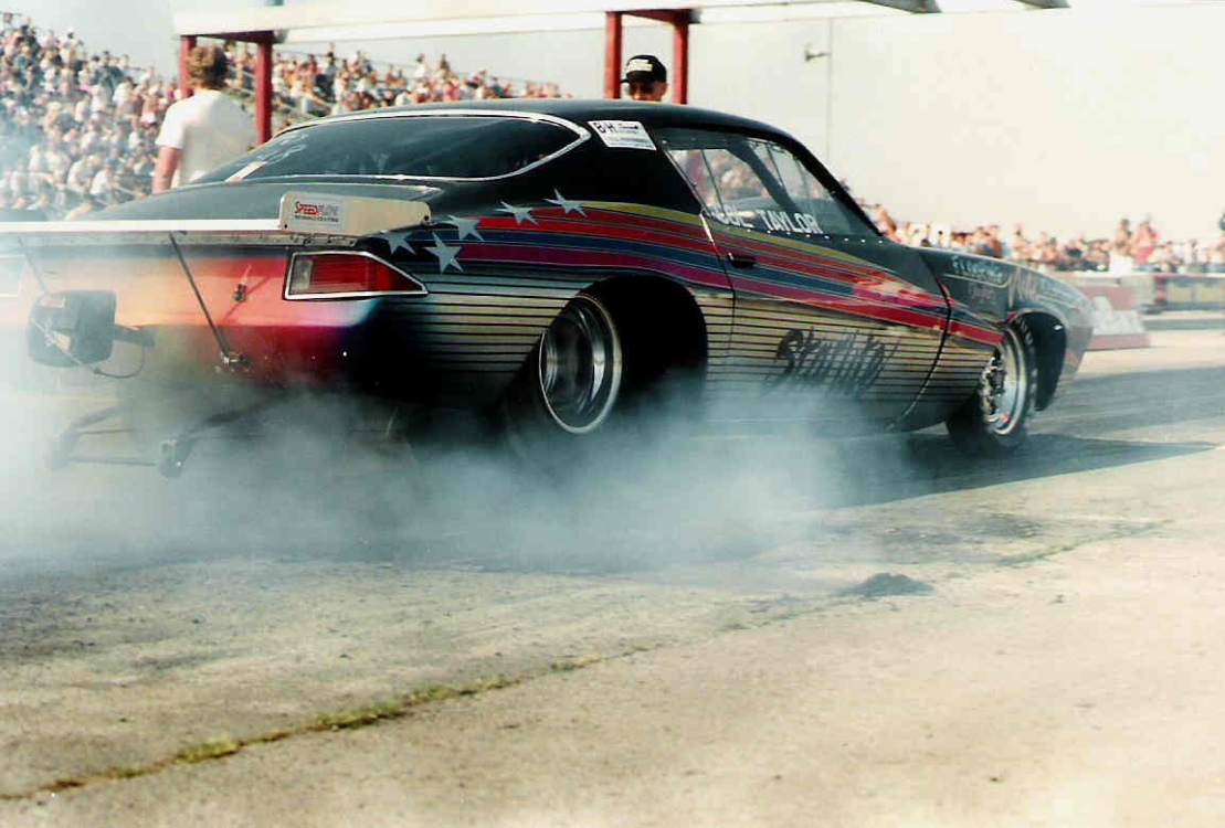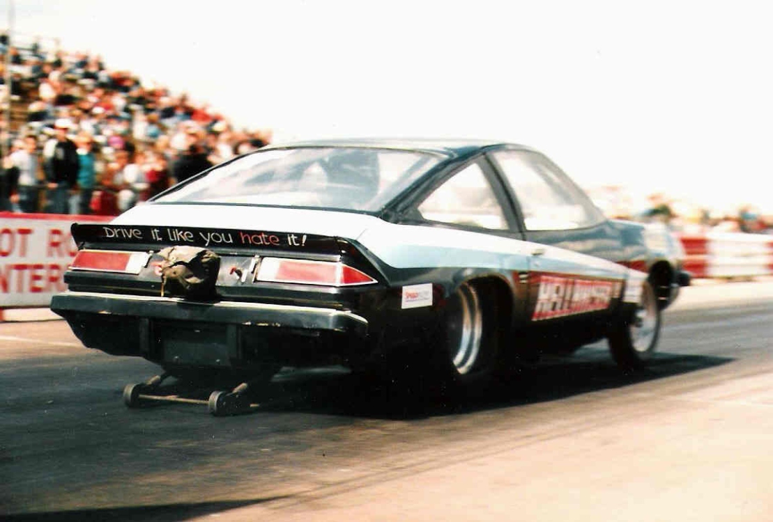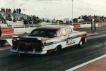 The next outing at York Dragway saw a cracked Powerglide case, a problem for the team on two other occasions as well in the following month. The car had a potent 492ci Chevy engine with Pontiac Pro Stock heads, and twin four barrel carburettors running on methanol, with an Enderle birdcatcher hat atop a handcrafted sheet metal intake manifold. The Powerglide gearbox sat behind an ATI torque converter with a 6500rpm stall speed, the power going to a Ford nine inch rear. The best times recorded for the Fastback, by Trevor, were 8.035/175 in 1990.