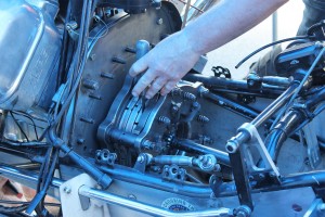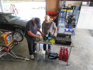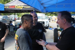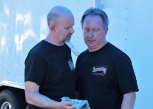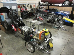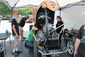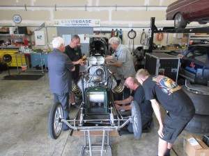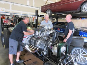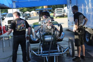 About ten feet away from the Bantam, parked on air jacks was our team mate's car. In order to fulfil an exhausting schedule, the team juggle three versions of Rat Trap. At this time, one of the other two was floating across the Atlantic on its way to Goodwood and the third, having recently returned from New Zealand, was making the three day trek from California to Tennessee. The two drivers towing the trailer were Ron Hopes brother Steve and his long time friend Jim Alvaney. The car had sustained some chassis damage in New Zealand and would not be fit for Bowling Green. Many of the major components would need to be swapped onto the car parked next to ours. Steve and Jim arrived during Saturday and the team got straight to work. As the weekend wore on, the years of repetition showed. Brian, his son Michael, Keith Dugan, Jim and Steve made the rebuild look effortless and by close of play Sunday, aside from a few details, we had two complete AA/FA's.