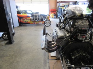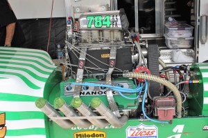 The track looked good. It was a tight right turn to get set up for the right lane but nothing too tough. Our first tune up was quite conservative, 86% nitro and a soft clutch. The car dropped a couple of cylinders at the hit but picked them back up about ten feet out, it stayed in the middle of the lane and we kicked off with a 6.46 at 214. We were third quickest but we had the fastest speed. Unfortunately, Ron had some issues on the startline and was unable to make a run. Nick found the return road easily enough and reported that the track was smooth. So far, so good. Back in the pits the heat was starting to bite and nothing on the car would cool down. The engine was in good shape and we were a little more comfortable with the track. Our second run later that afternoon would see us run with Randy. Nick brought the fuel mix back up to 89%; we serviced the clutch and got ready for round two. Given the temperature, along with the other three Altereds, we skipped the warm up. By the time we got into the lanes Nick's hydration level was going south, his hands were starting to cramp up and he was struggling to straighten his fingers. It was nothing too dramatic but provided some incentive to tackle the following days water intake with a little more vigour. The run with Randy was quite eventful. Nick left a little early but I doubt that our 6.55 at 224 would have covered the Fiats mid '.40 anyway. The fun came at the finish line when just into the shutdown area we were treated to a big cloud of smoke. Great.... I turned to Scott and indicated that we had work to do. Scott's eyesight, being significantly better that mine, brought the news that in fact the parachutes hadn't opened and that the smoke was off the tyres. I'll be honest; I replied "thank God for that, we don't have to take the heads off." In my defence, although it gets his heart rate up, Nick gets the car stopped. During the early years, before we moved the wing, the parachutes would sometimes deploy into a dead area behind the car and fall onto the wheelie bars. It's not the first time the brakes have had a workout. When we viewed the GoPro footage he'd got the job done with room to spare. By his own admission, Randy earned himself a late steering correction after spending too much time watching Nick sliding towards the end of the shutdown area. We didn't need the logger to tell us what had happened. The car was soft from the startline and when Nick shifted into high gear, the car disappeared in a cloud of clutch dust. We had the fastest speed of the round but we were way short with the clutch. Brian, Keith and the Rat Trap team were firing on all cylinders. Ron carded a 6.37 and dispatched Nanook with room to spare. The engine in the orange Bantam looked good as new.