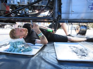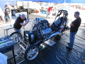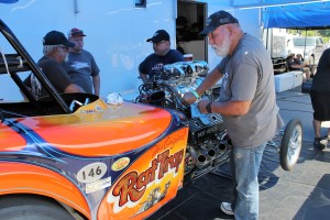 After a light breakfast we were at the track by 8.00am. Our first run was scheduled for early afternoon and we were down to run Rat Trap. The Fuel Altered format for the event was a four car Match Race. In this environment you have three obligations. One; When you're called you snap on the tow rope and move. Two; You make a run from A to B at an acceptable pace. Three; you don't oil the track. If you can fulfil these requirements, track promoters will take your call. The other two cars in attendance were Randy Bradfords Fiat and the Hough's super tough Nanook. Our warm up went o.k. but if it had been a Cackle Fest, Rat Trap would have been the clear winner. It was jumping off the air jacks. After our tyre roll out issue at Bakersfield, Scott was all over the slicks. He got them to within 3/16" and kept them there all weekend. We were in the lanes by 1.30pm and the heat went to work. Rebecca had previously had a stern word with us about staying hydrated. Scott and I are pretty disciplined at this but Nick is hopeless. He's good with sun block but rubbish with water.