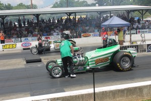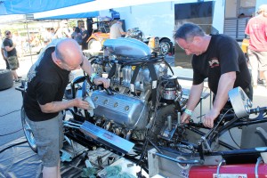 Beaten by the sun, we'd left the routine service work normally completed the previous evening in favour of an early start the following morning. We new that the engine was in good shape but after the run against Randy, we decided on a fresh clutch pack. By mid morning the work was complete; we left the nitro load at 89%, hung some counterweight on the clutch then sat in the shade while the sun did its work. Our first run was again scheduled for early afternoon and would bring us a date with Nanook. Our e.t.'s were fairly even and at that point we were close to 12mph faster. To be fair, our speed advantage probably flattered us a little. For a Fuel Altered, the Bantam was proving to be reasonably well behaved but our fellow competitors were having a pedal or two. Both runs on Friday were in the left lane but as we pulled out of the staging lanes Nick took his first look down the right. The official gave us the nod, I took a quick look across at Dave Hough and Scotty tapped the starter. Over the last few events, the three of us have begun to enjoy the car a lot more, it's not something that we've discussed but it's happening. The car is feels as though it's starting to work with us. When it ran the alcohol Chevy it was fun but the car had a nasty streak, anywhere up to the 800ft mark it would jerk the front end in the air and even after the front eventually settled it would wander around all the way to the finish. The nitro engine was a gamble but has proved to be one that has paid off. Before the Donovan was installed we looked long and hard at how we could make it more of a race car than an exhibition car and the few mods we made seem to be paying off. It's difficult to quantify and I'm sure every team has its own ideas but for us the number is six successful runs out of seven. Anything below this and we would probably consider our car more suitable for exhibition purposes than a straight eliminator.