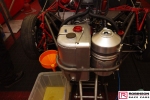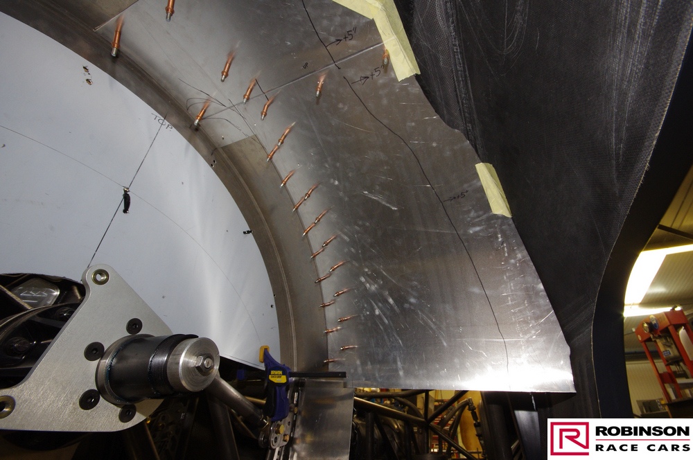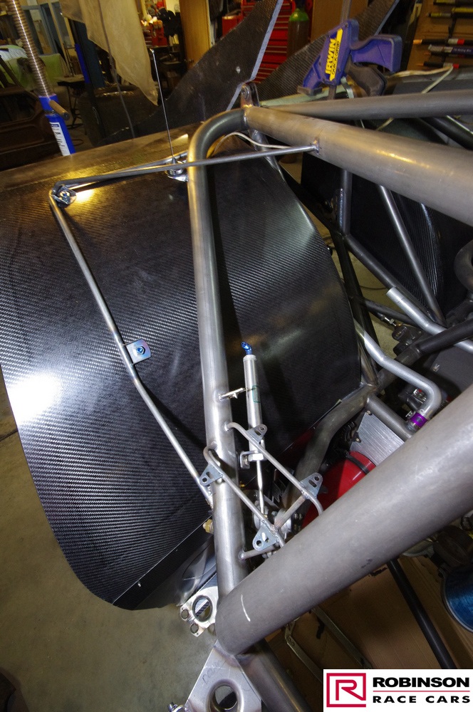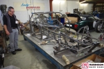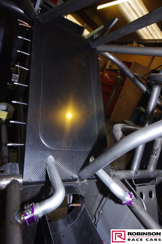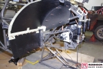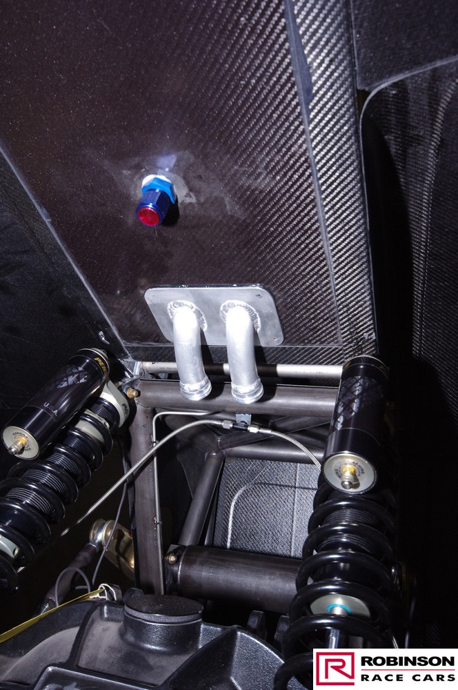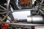 The intent was to build in as much lightness as possible which was demonstrated when the Camaro tipped the scales at 200 lbs less than the predecessor Studebaker. In part this was achieved by using more exotic materials and in part by using less of conventional materials where permitted by the regulations. Probably the most significant design change was the use of a carbon composite spine to support the rear of the car. Based on carbon fibre skins with aluminium honeycomb sandwiched between this U-shaped section rested on the rear part of the chassis above the suspension mounts. This also provided a volume to be used for the puke tank. See pics 58, 59, 76 and 98. The structure was designed to accept all the downforce generated at 240 mph. Andy’s short flight at the end of the 2018 season demonstrated an unexpected advantage of the arrangement when the structure received a load from below and collapsed thus reducing the Camaro’s aero profile by 40%. There is no plan to confirm this advantage with the new car.