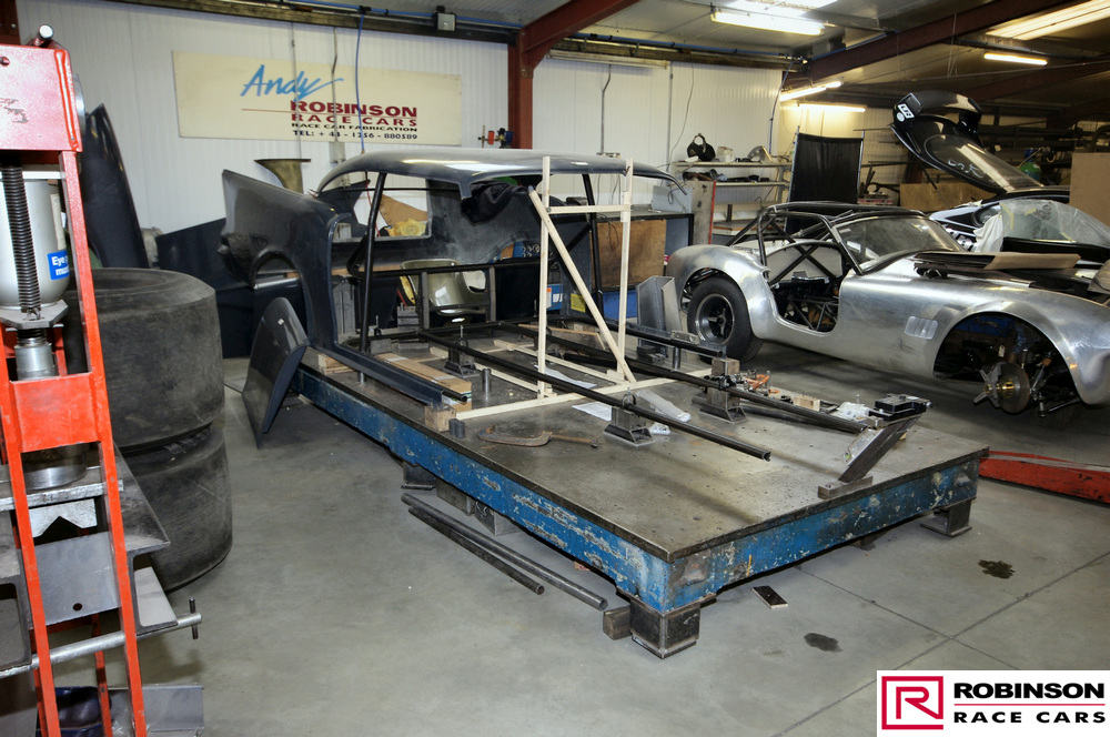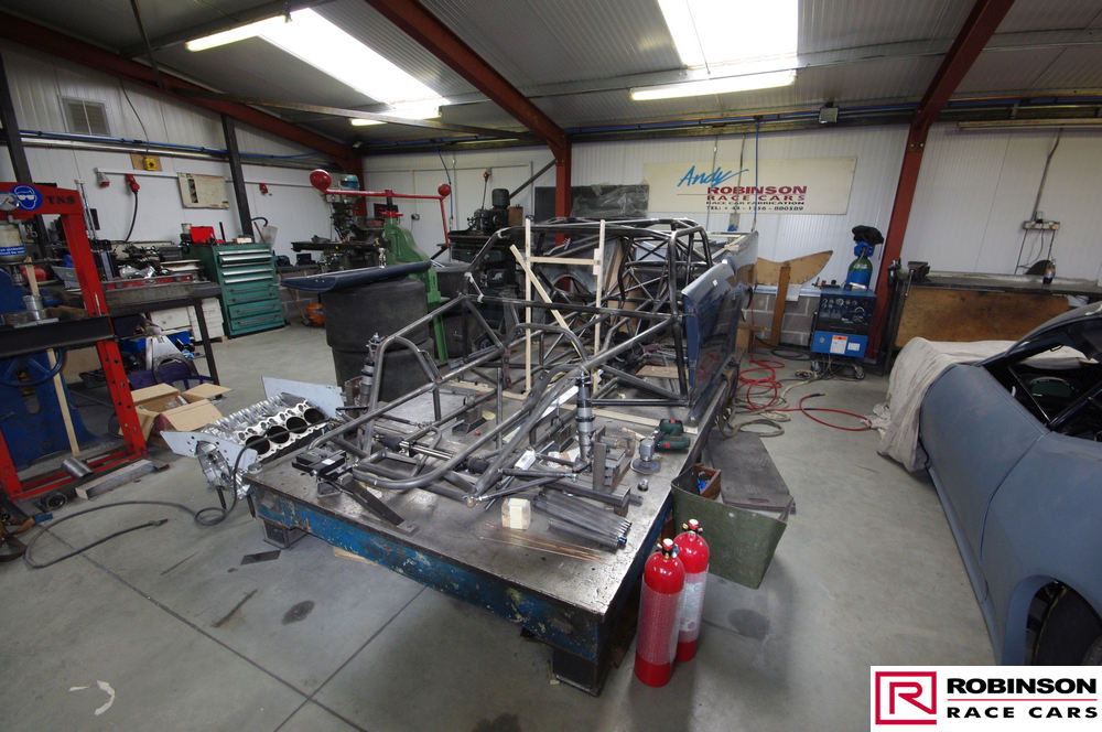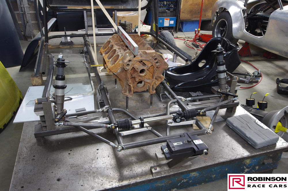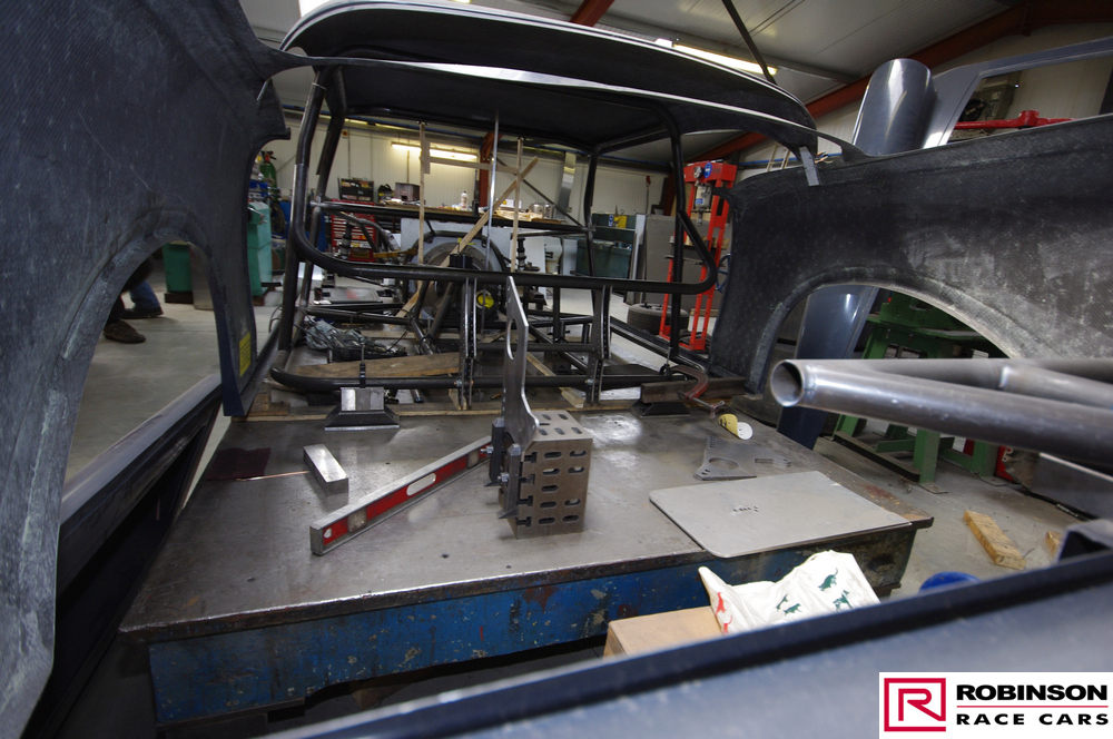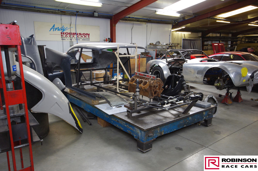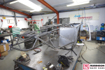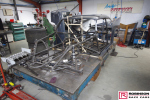 The build started with the fireglass body placed on a chassis jig with the engine located (pics 1 to 4). Front suspension followed (pic 5) and then the Lenco gearbox was located. Frame rails were added and the car began to take shape (pics 7 to 14)