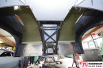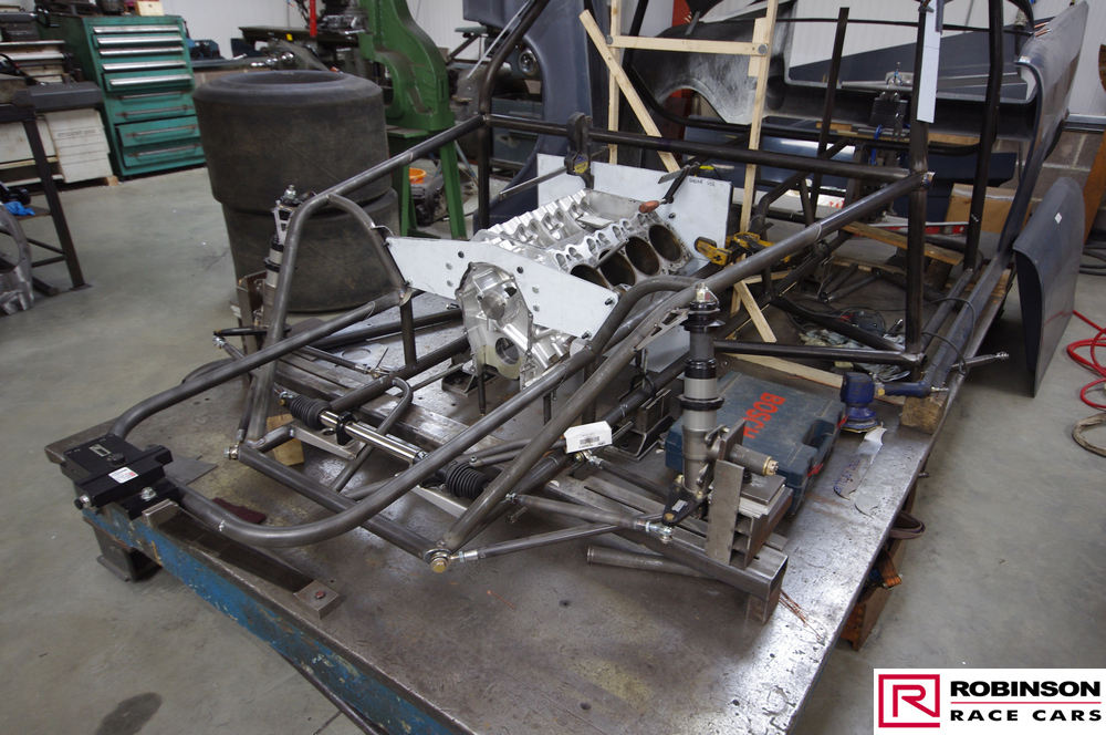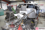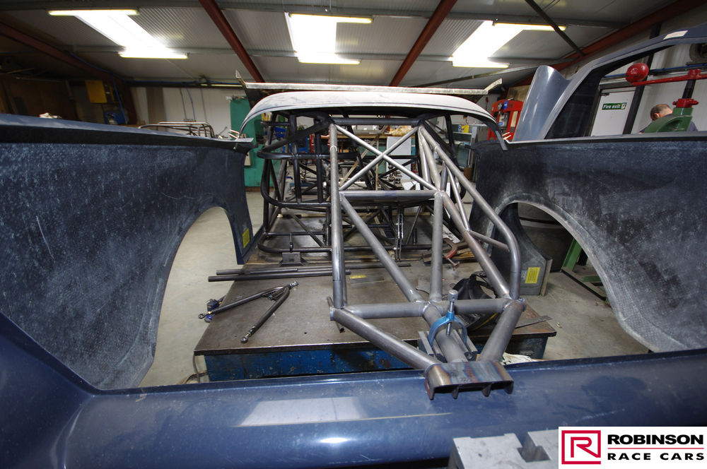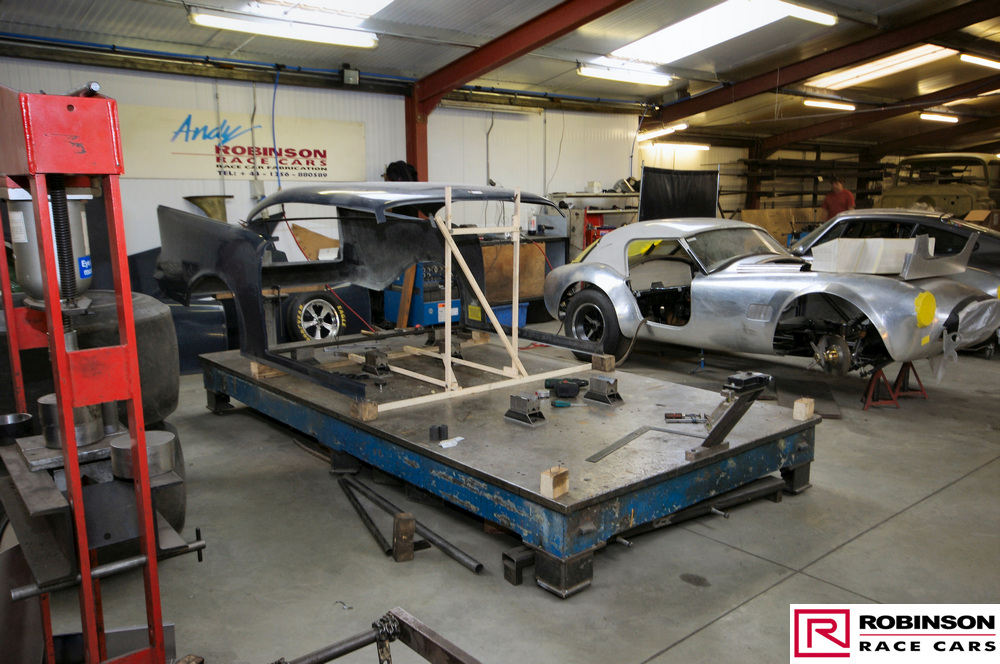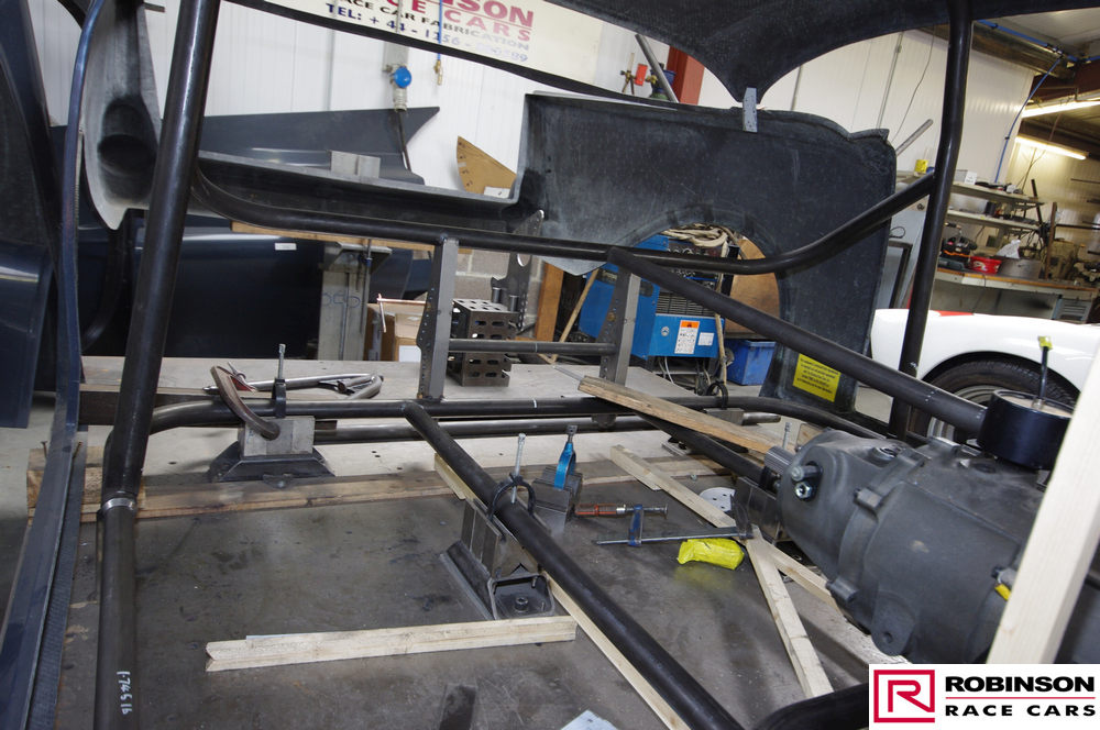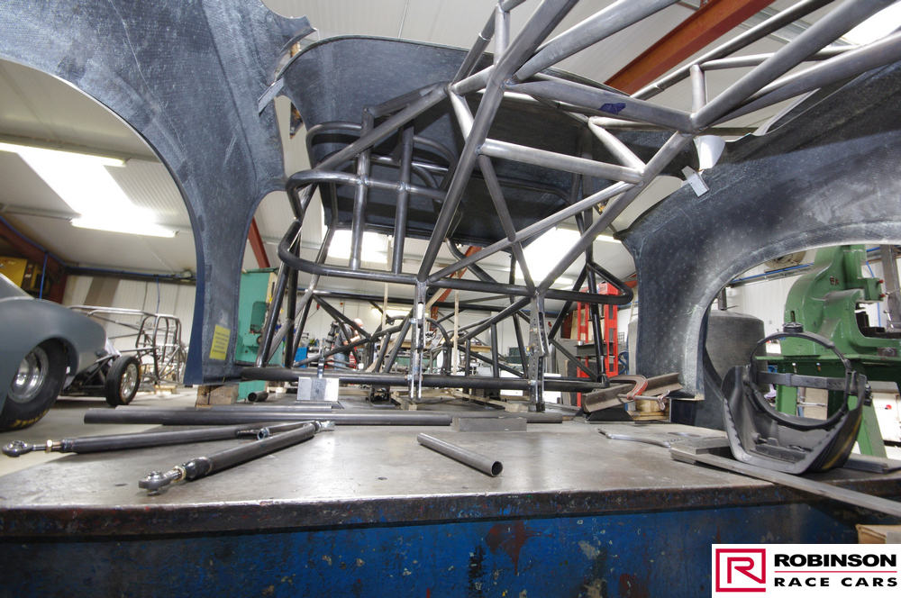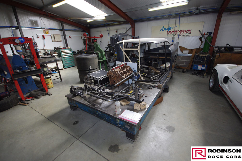The build started with the fireglass body placed on a chassis jig with the engine located (pics 1 to 4). Front suspension followed (pic 5) and then the Lenco gearbox was located. Frame rails were added and the car began to take shape (pics 7 to 14)