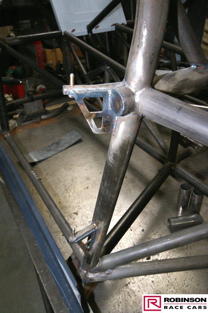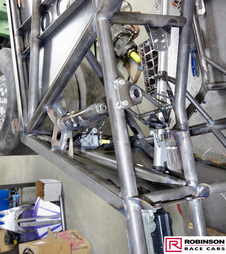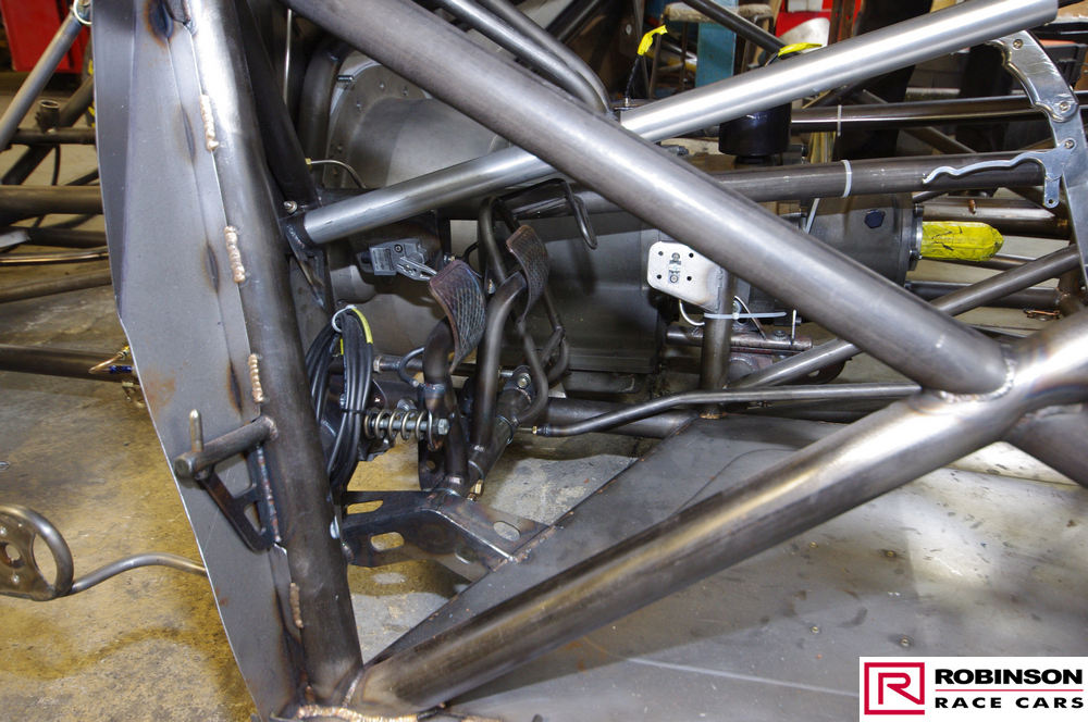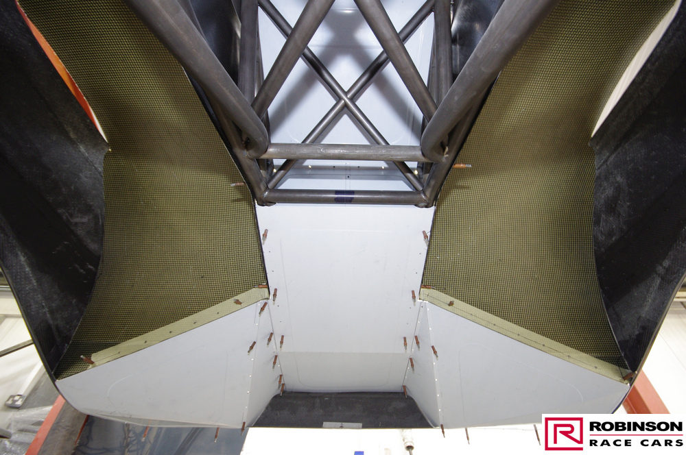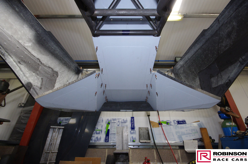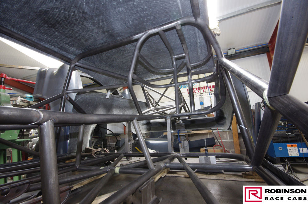 The steering rack was next (pic 15) and then the cage was created (pic 18). Front body panels were located (pic 20) and then the chassis was connected up to the underbody panels (pic 24 to 30). The rear end underbody was fitted before the seat was added (pics 31 to 33).
