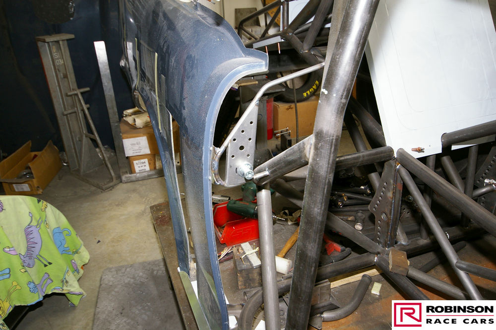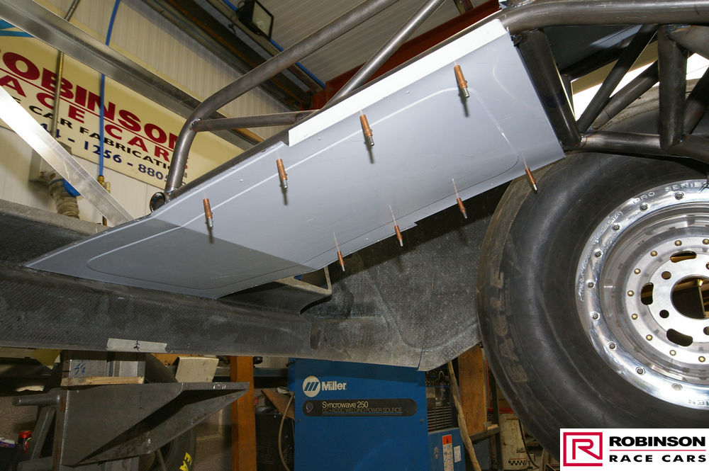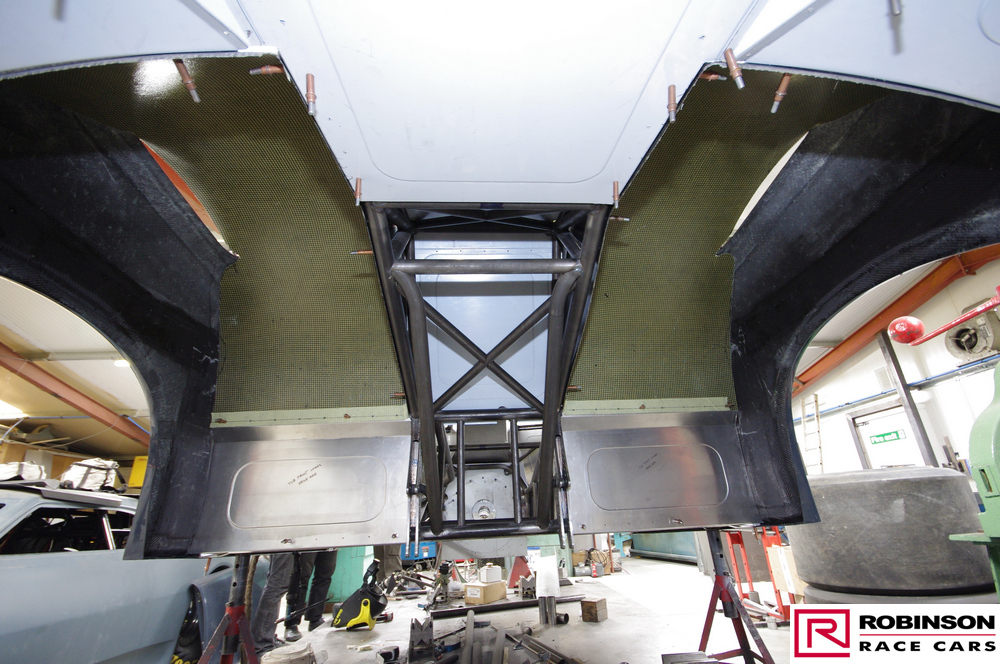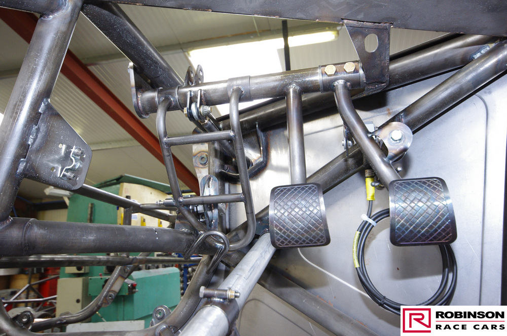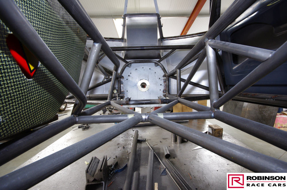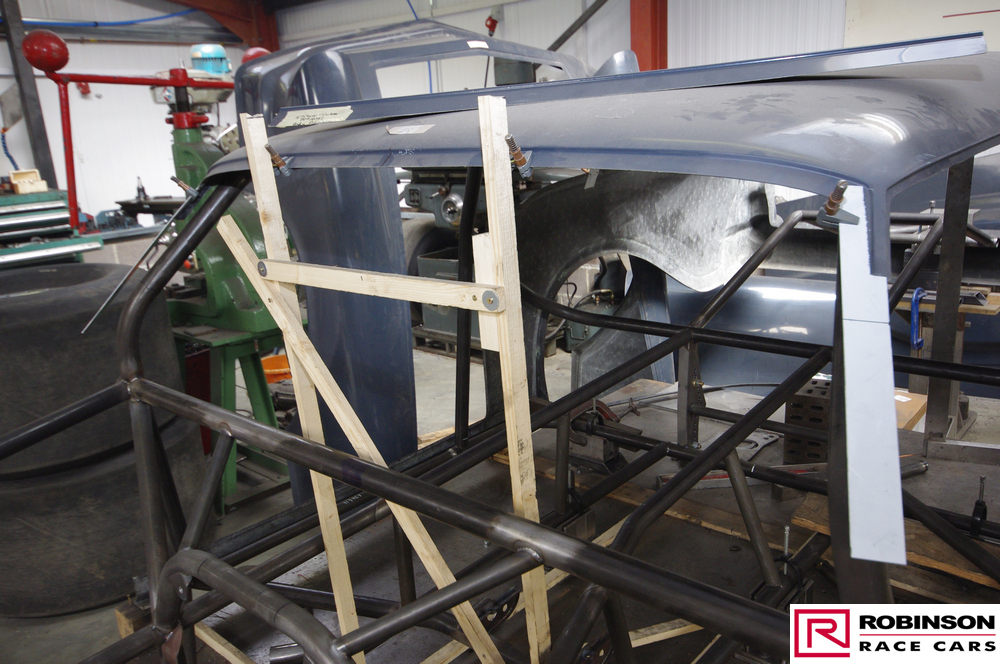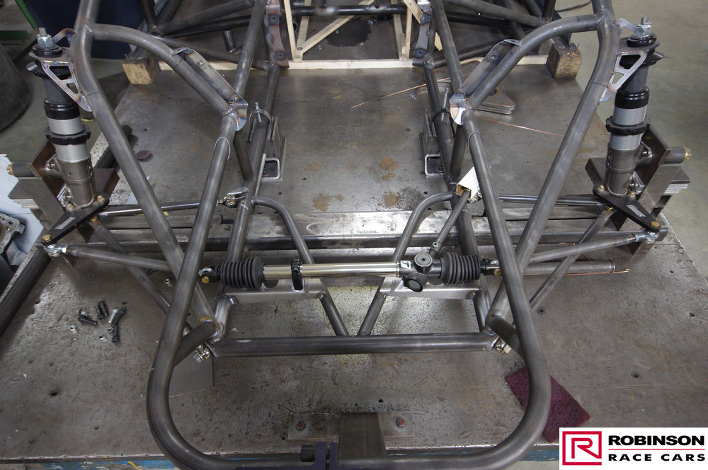 The steering rack was next (pic 15) and then the cage was created (pic 18). Front body panels were located (pic 20) and then the chassis was connected up to the underbody panels (pic 24 to 30). The rear end underbody was fitted before the seat was added (pics 31 to 33).