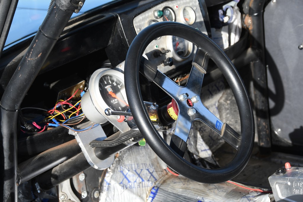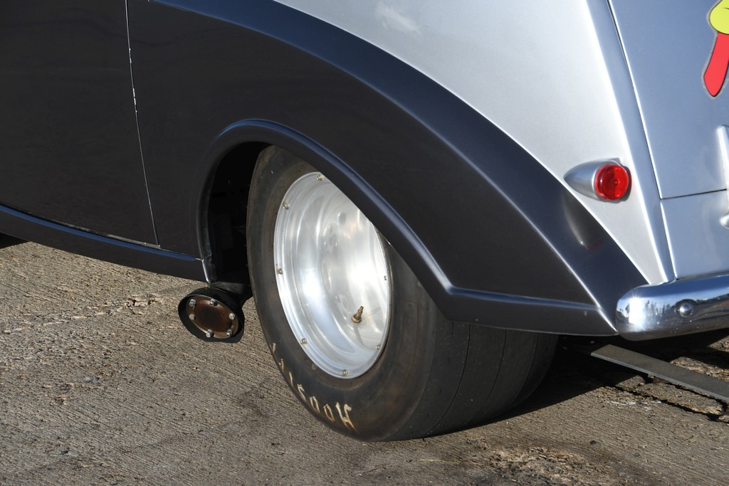 The standard drum brake setup is now superseded by modern day aftermarket Wilwood disc brakes on all four corners, more than capable of arresting the 2600lb car’s oversize rolling stock at the end of any high speed hauling. Weld Racing alloy rims -- 15 x 4 up front and custom 15 x 13 aft -- mount Mickey Thompson Sportsman 25 x 7.5 and Hoosier Quick Time Pro 28 x 14.5 triple-grooved rubber, respectively. The latter are fully compliant with the Open street class in which the Mayflower is competitively thrashed along the strip and, importantly, the fat rear tyres also bear a Department of Transport number indicating their legality for use on the public highway, a de rigueur requirement for Sam’s competition category. He did point out that although they meet class-specific rules, he wouldn’t like to push his luck on damp road surfaces as their minimal tread grooving offers little in the way of water dissipation.