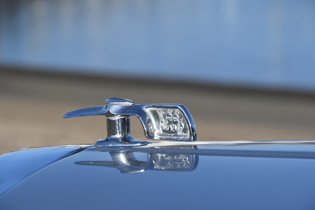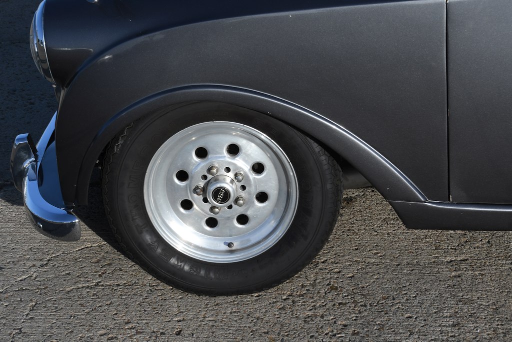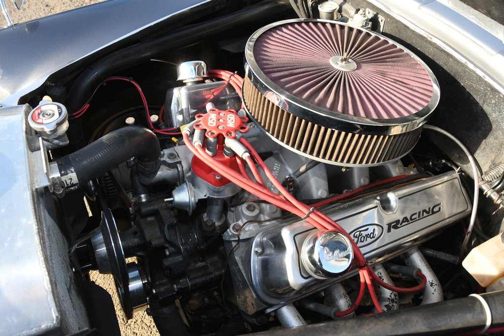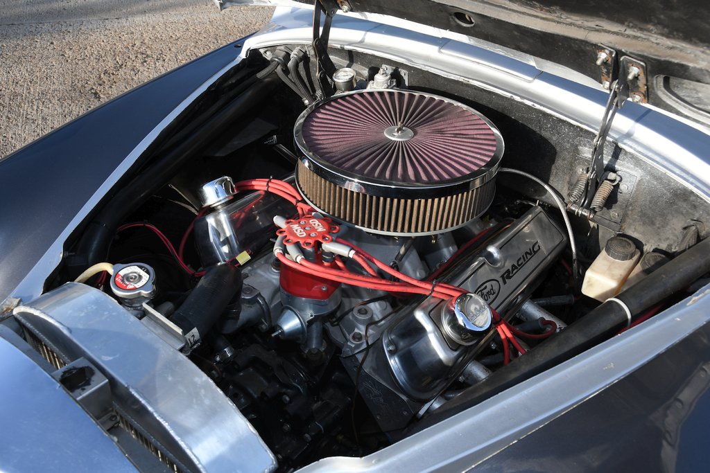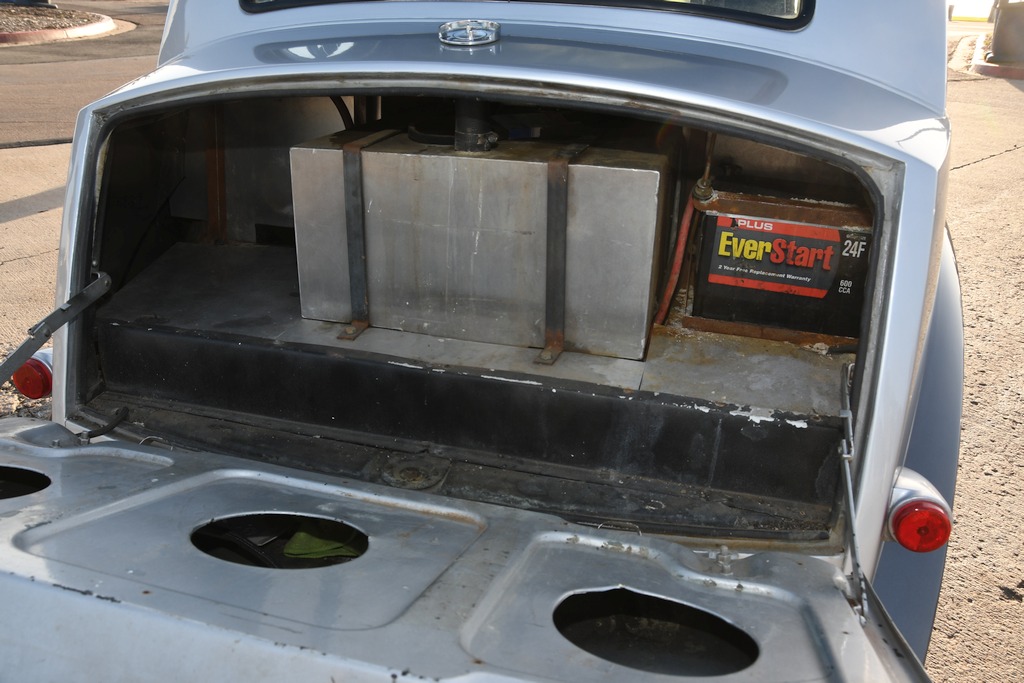 What makes this one-of-a-kind Mayflower particularly engaging is that the Fisher & Ludlow two-tone coachwork has retained its originality. Okay, it has been resprayed in modern-day metallic silver and grey hues, but all the factory steel panels remain in situ. The front turn signals may now take the form of flush-fitted LED units, but the precursors were in a pretty naff state and Sam was unable to procure any standard replacements. There’s now a pair of Harley-Davidson motorcycle wing mirrors mounted at the front of the wings as the old pot metal versions were “in a rather fragile state.” Access to the engine bay is through the normal twist and lift latch, the mechanism of which has been repaired and now incorporates a modified landing panel. The tight fitting V8 powerplant sports an MSD programmable ignition system, with other points of note under the bonnet being a fuel pressure gauge mounted on the firewall that checks ingestion of petrol that flows through a Holley 4150 950cfm carburettor, spent exhaust gases being vented to the atmosphere through 4-inch custom pipework and mellifluously exiting on each side just ahead of the back wheels. There’s also an aftermarket custom radiator designed to fit a Ford Model A but which perfectly fits in the Mayflower aperture.