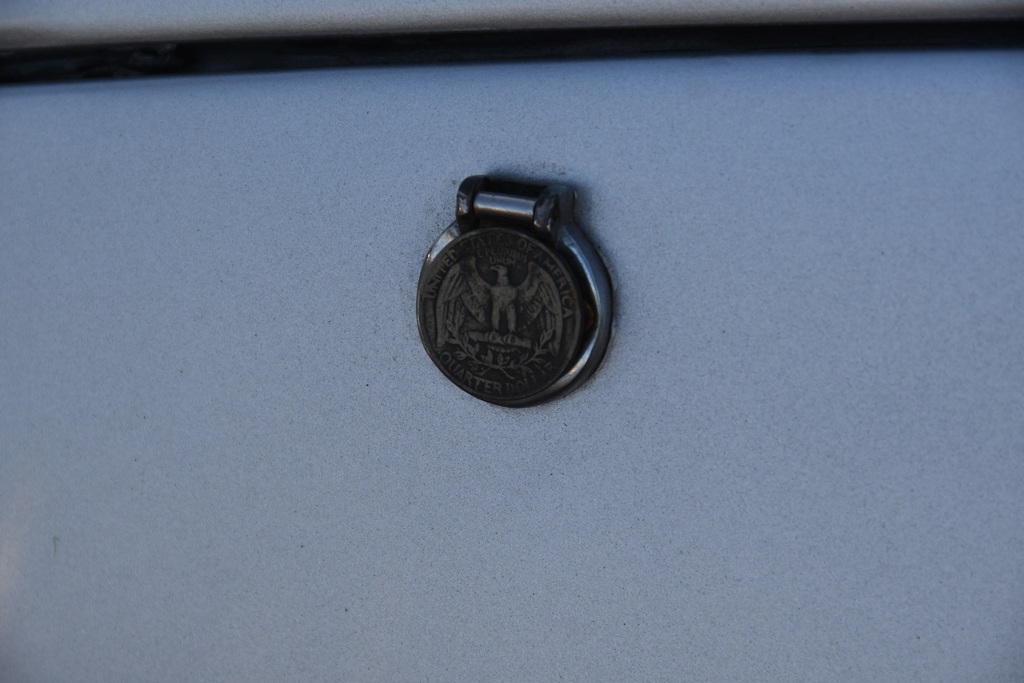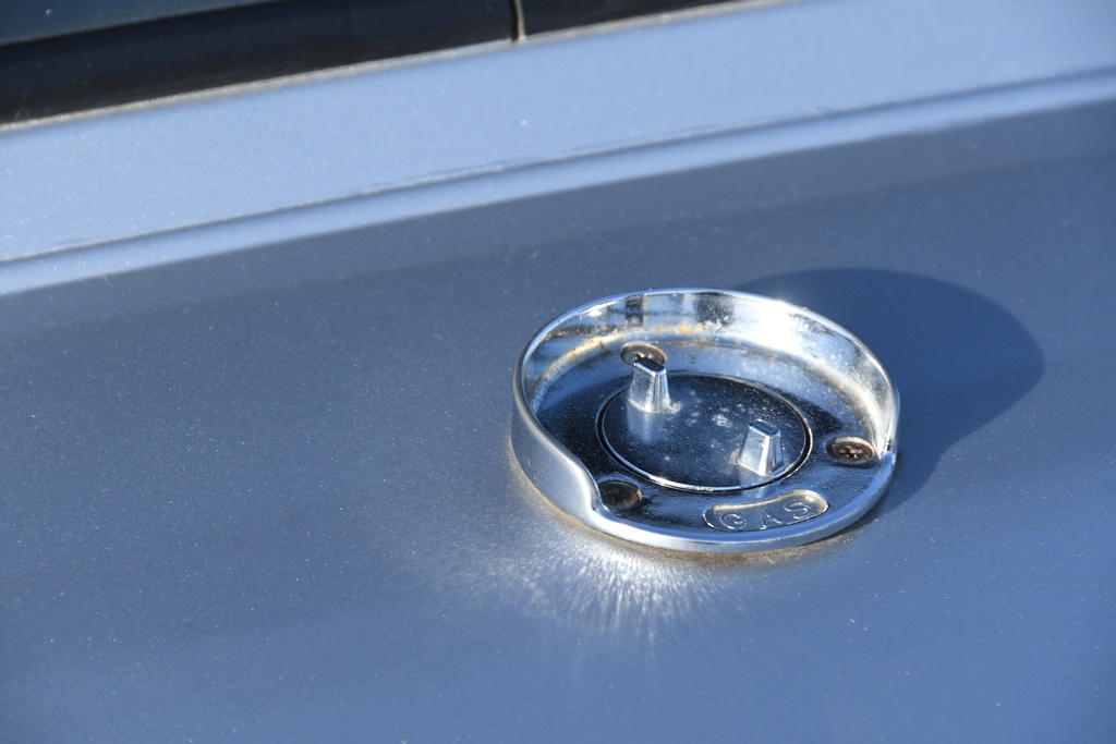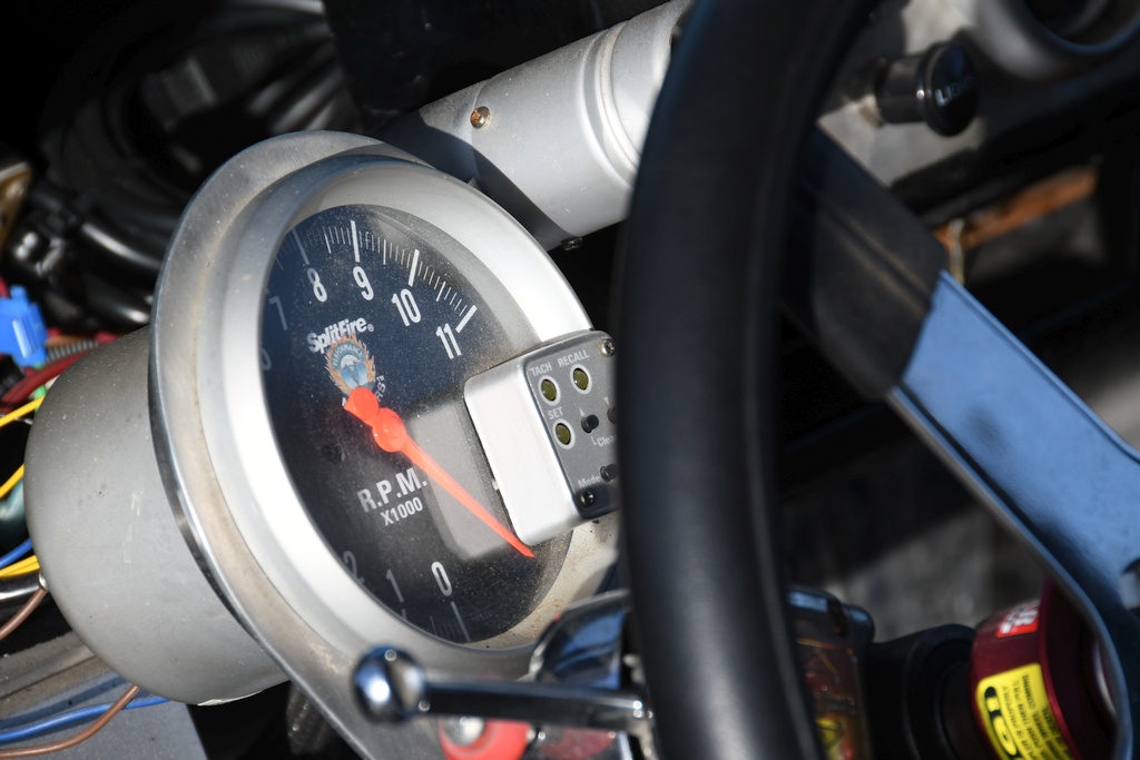 The stock wind-up windows and opening quarter lights have been retained and operate fine and dandy, although the windscreen wipers and radio aerial have been taken off. A fan has been installed to keep the driver cool when waiting in the staging lanes to make a run and there’s a full width interior mirror to better view what’s occurring behind. In the boot a 20-gallon(US) fuel cell holding 91 octane unleaded takes the place of the normal 10 imperial gallon tank, and is also home to a regular 12-volt battery, the mandatory cut-off switch for which is located above the rear bumper. A point of note concerns the boot lid latch covers which had deteriorated to a point where they were ineffective, Sam using his ingenuity to make natty replacements using a couple of 25 cent coins (or ‘quarters’ in Stateside vernacular) in conjunction with a pair of machined hinge pins.