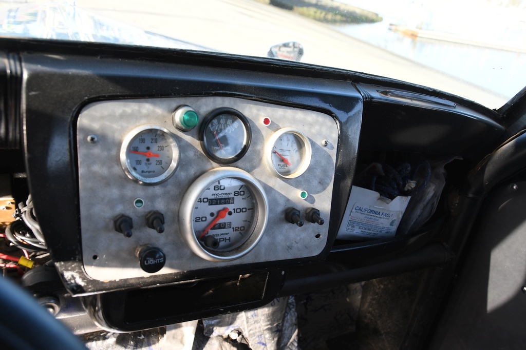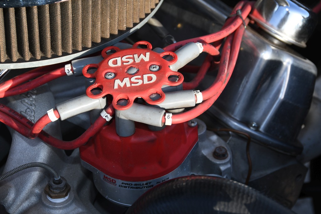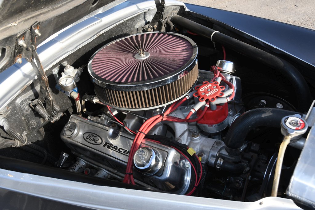 The task of endowing the car with a respectable degree of performance in keeping with its intended racing role – Sam has been a regular competitor at Barona Drag Strip, an 1/8-mile track built on Indian reservation land in Lakeside CA, where his best numbers at time of writing are 7.02-seconds @ 96mph – was entrusted to a local man, Steve Beck, proprietor of Southtown Custom Hotrods, whose workshop is also located in Chula Vista. With the body separated from the original chassis, a National Hot Rod Association-certified custom mild steel race counterpart was fabricated, replete with Ford Mustang II-style narrowed front end. The stock firewall was modified to initially accommodate a small-block Ford 302 that was stroked to 347ci, this unit being superseded in 2019 by a 351 Windsor V8 that has been bored and stroked to 427ci (7 litres). Outfitted with a passel of go-faster goodies, the current combination endows the Fifties classic with a stonking horsepower output in the region of 625bhp. Torque is transferred to a Ford narrowed 9-inch  Detroit Locker rear end( packing 4.10 gears) through a B&M Pro Ratchet-shifted C4 3-speed automatic ’box. There’s also a line lock and transmission brake installed, de rigueur fitments for drag racing modus operandi. Credit for the transmission work goes to specialist Bob Harrington and engine uprating was deftly carried out between both Sam and John Baxter of Baxter’s Machine in National City.