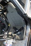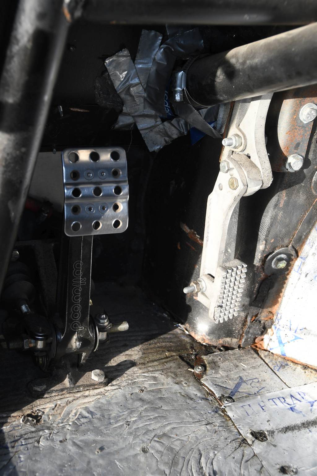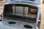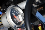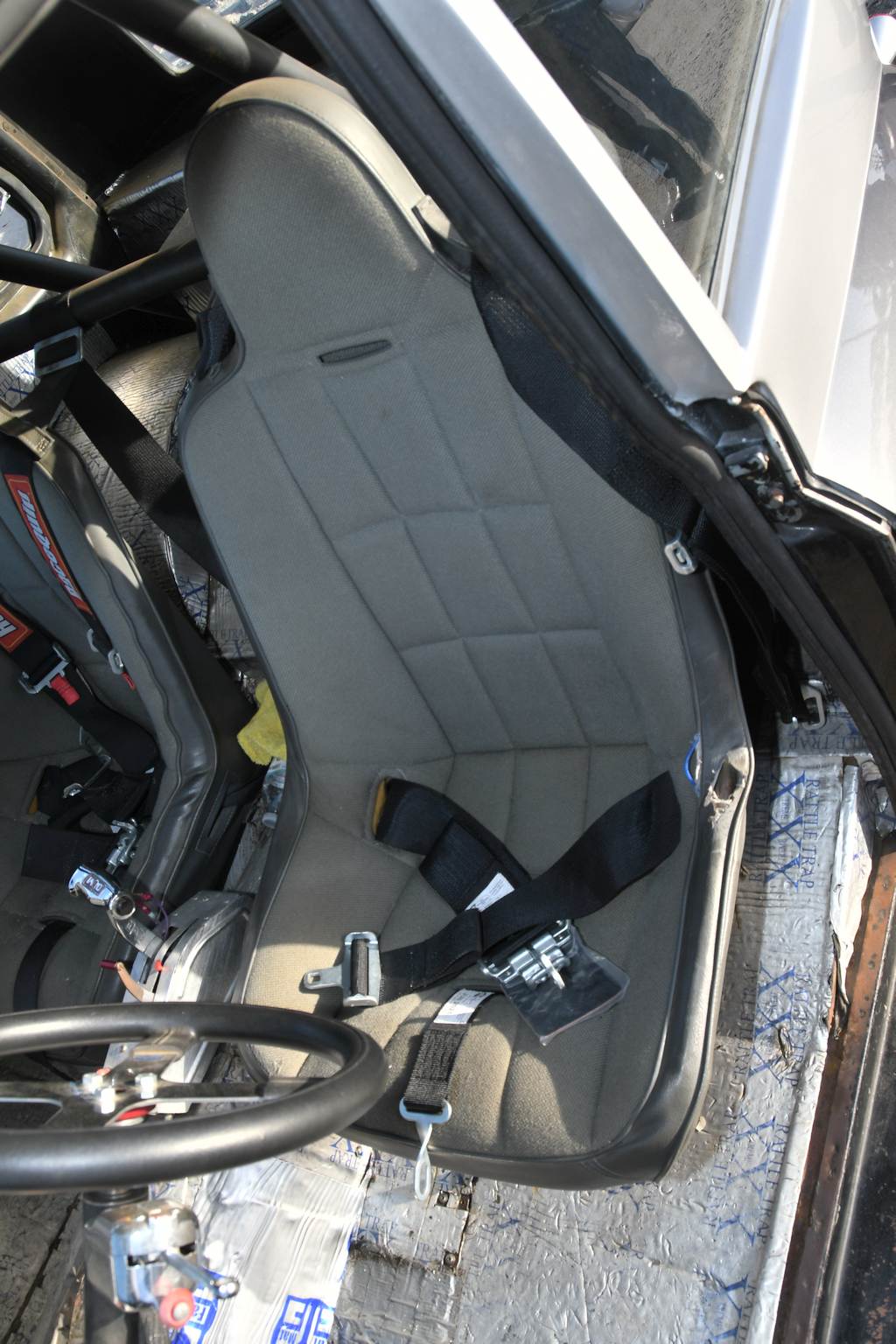 Utilitarian interior appointments of note include a pair of cloth-trimmed racing seats in place of the optional extra leather covered bum perches with which it rolled off the assembly line, along with a brace of RaceQuip 5-point harnesses. Comfortably and safely secured in the spartan cabin, Sam can monitor vital functions through a complement of aftermarket analogue instruments outfitted in a custom alloy binnacle located in the car’s normal location: the quartet comprises Auto Meter Pro- Comp Ultra-Lite speedometer and fuel level gauges, plus Sunpro water temperature and oil pressure. A SplitFire programmable tachometer and shift light is located directly behind the Schroeder 14-inch quick-release steering wheel and allows the driver to maintain a needle eye on matters of importance as he floors the custom throttle pedal. The back seating is long gone, the tin-trimmed rear area being largely been taken up by the wheel tubs and roll cage. Swathes of Rattle Trap sound deadening mat are fitted to minimise noise intrusion and the padding’s effectiveness is just the ticket.