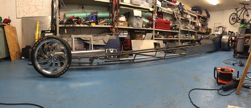 The following day I drove to Wichita and met up with a couple of internet friends and spent a few hours chatting and drinking coffee. Monday I drove to N&P and met Frank and Scott Parks who made me very welcome, I stayed most of the day taking pictures, asking questions and generally being a nuisance. They were more than helpful and even now I can E-Mail them with a question and always get a reply with help within a few hours. To my recollection about 4:00 pm we started loading the Dodge with parts, it was the ideal vehicle with all five back seats folded flat into the floor. Four wheels, four tyres, complete axle in parts, brakes, steering, carbon fibre seat, cowl and nose, bent tubes, parachutes and plenty more. I set off back to my hotel and got my head down as I had planned to go back to N&P and ask all the questions which I hadn't on the first day and then set off for my first stop in St Louis, Illinois en route to Franklin in Tennessee, the idea being I would drive about 275 miles the first day and then the other 425 miles the following day. With all the best-laid plans I awoke to snow the next morning, only a light dusting of powder but it was very cold and the forecast was for lots more snow that day. I left about 6:30 am having decided not to call back to N&P and see how far I could get before the snow stopped me. Little traffic helped but getting out of the inside lane into the snow-covered lane to overtake the really slow vehicles was a problem. The snow continued to get worse as I drove. Passing numerous accidents including one that was probably twenty five miles of wrecked trucks and cars and seeing a great many cars leave the road in all directions. I arrived at my booked hotel early as I had foregone the stop at N&P, I stepped out of the car into about six to eight inches of the white stuff... do I stay and get some rest or do I cancel and see if I can drive out of the snow before I get stuck here? I took the latter option and cancelled my room and drove off in to the early afternoon sun. Eventually as I drove into Kentucky at about 5:00 pm the snow slowly eased off into torrential rain which lasted until I had nearly got to Nashville where it eased off. At about 10:00 pm I got to the hotel into which I was booked for the following night, and they had a room. So another long day and roughly 700 mile through snow and rain touching on six different states. I did mail Scott the following day to report in on progress and he informed me that if I had stayed I would have been snowed in as they had eighteen inches and very cold temperatures. After a good sleep I set off for my good friend Duane's house. He lived about twenty miles south of where I was staying. Over the next few days we built a crate to ship everything back to the UK. The size of the crate was based on the longest single length of chrome moly needed in the chassis and the width and height of two slicks, the tube was all in the bottom of the crate and everything else was packed in on top including two more slicks and an axle for someone else. We visited Home Depot several times for timber, bubble wrap and screws etc. By the end of the week everything was packed in including the carbon fibre cowl which we suspended on nylon cord from the top of the crate so that it did not touch anything else. We spent days building and packing and evenings chatting about the differences between the two countries: both Duane and I learned a lot about where the other lived. I flew out of Nashville back to Detroit on the Sunday afternoon where I picked up another rental car for my business trip. I spent a week in Detroit assisting with the build and sign-off of some new cars with which we ended up on the Canadian border for three weeks cold testing. On the final day we were at minus 36° C at 6:30 am when we left the hotel; at 10:30 pm the same day I got off the plane at Los Angeles airport at plus 25° C - a difference of 61° C - and began a twelve-day holiday taking in the March Meet at Famoso Raceway. I had left the UK on 1st February and got back around 17th March. After a few delays sitting about in the USA the crate eventually got put on a ship and arrived in late June 2014. Unloading it with the aid of a borrowed forklift mounted on the front of a tractor was precarious to say the least, but we got it back to my workshop somewhat battered and bruised but intact. As many of you know it's always a pleasure to unload a parcel from the States so you can imagine the fun opening a 15' x 3' x 4' foot parcel. Needless to say I am still using up the wood it was made of.
