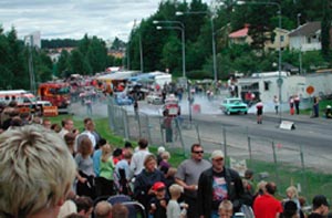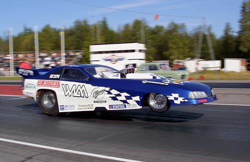 Jonas: My wife Monica is our crew chief and the one that make sure that we are ready to run at the right time and are clean and not starving. Anders Ingelsson , Arne Westerberg and Johan Wiksten are the mechanics. Eurodragster: What plans do you have for the future? Jonas: Make the car more consistent Eurodragster: What is your favourite story/moment involving the car? Jonas: I was invited to be part of the opening of the Gold Road between the village Adak and Kristinneberg , First there was a folkdancing team dancing and after that we did a burnout and a launch. It was a funny feeling siting strapped in the car with 10 dancers and 5 violin players hopping around the car! Eurodragster: What is your favourite story from the pits? Jonas: Mantorp 2001 I was taking a walk in the pits when my wife called me on the cell phone and told me that there were two Norwegians drinking beer and taking our fuel system apart! I hurried back to our bus only to find out that It was Anders who had met a Norwegian that could help us with our Enderle so it was no problem , and we went from 9.09 to 8.77 and made it to the quarter final of that race. Eurodragster: What do like most about the sport? Jonas: All the nice people and the family spirit around drag racing all over the world.