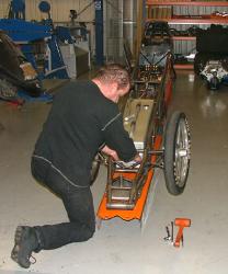 Steve Turner: The first job before we could do anything was to strip the dragster down to a bare chassis. The car has been standing around at shows for the last two years, so we need to go through everything very carefully. There are three upgrades which need doing to get the chassis legal for 2006. Firstly we need to fit the titanium shielding around the cockpit. We are actually fitting more than the FIA regs are asking for, and wrapping pieces right alongside the drivers head to the front of the roll cage, as well as going further over the head than required. Secondly we need to fit the support brace which runs behind the axle and between the bottoms of the rear wing stand. The final upgrade has just come in this year and requires extra chassis diagonals between the bottom chassis rails in front of the cockpit. Eurodragster.com: Where do you go to find out what it is you need to bring a Top Fuel Dragster up to spec? Steve Turner: Adrenaline has all the latest specs for the Top Fuel class in-house, so not far to go for that at all.